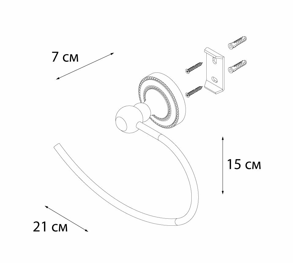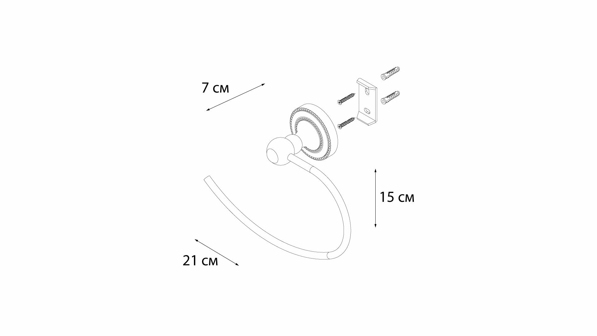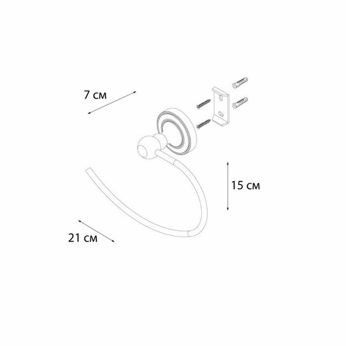 полотенцедержатель полукольцо, монтаж: настенный. Ширина: 19,5. Высота: 14 см. Глубина: 6,8 см. Метод крепления: шурупы. Тип рисунка: без рисунка. Фактура: гладкая. Форма: округлая