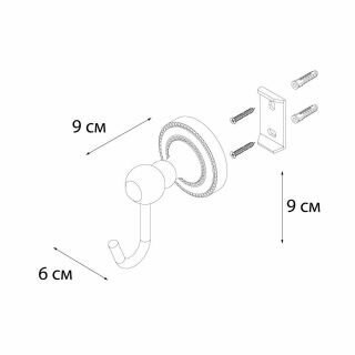 крючок одинарный, монтаж: настенный. Ширина: 5,7. Высота: 9,5 см. Глубина: 9 см. Метод крепления: шурупы. Тип рисунка: без рисунка. Фактура: гладкая. Форма: округлая