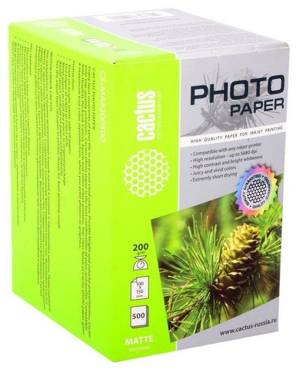 Бумага не ворсится по краям, углы целые. Поверность приятно шершавая — на черно-белых снимках шикарно смотрятся оттенки и полутона, не смыливаются при печати. Бумага без запаха, между собой листы не склеиваются в пачке. После вскрытия упаковки, бумага не скручивается и не желтеет, даже если пару месяцев так лежит в коробке. Ни разу не пожалел, что перешел с дорогой епсон бумаги на Кактус — цена ниже, а качество такое же.