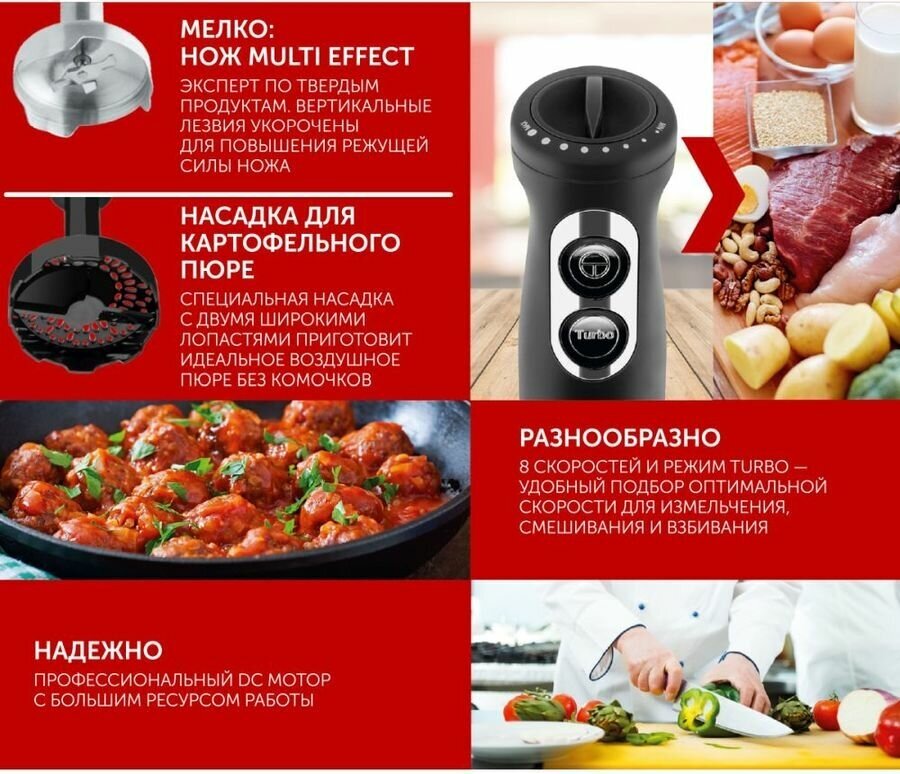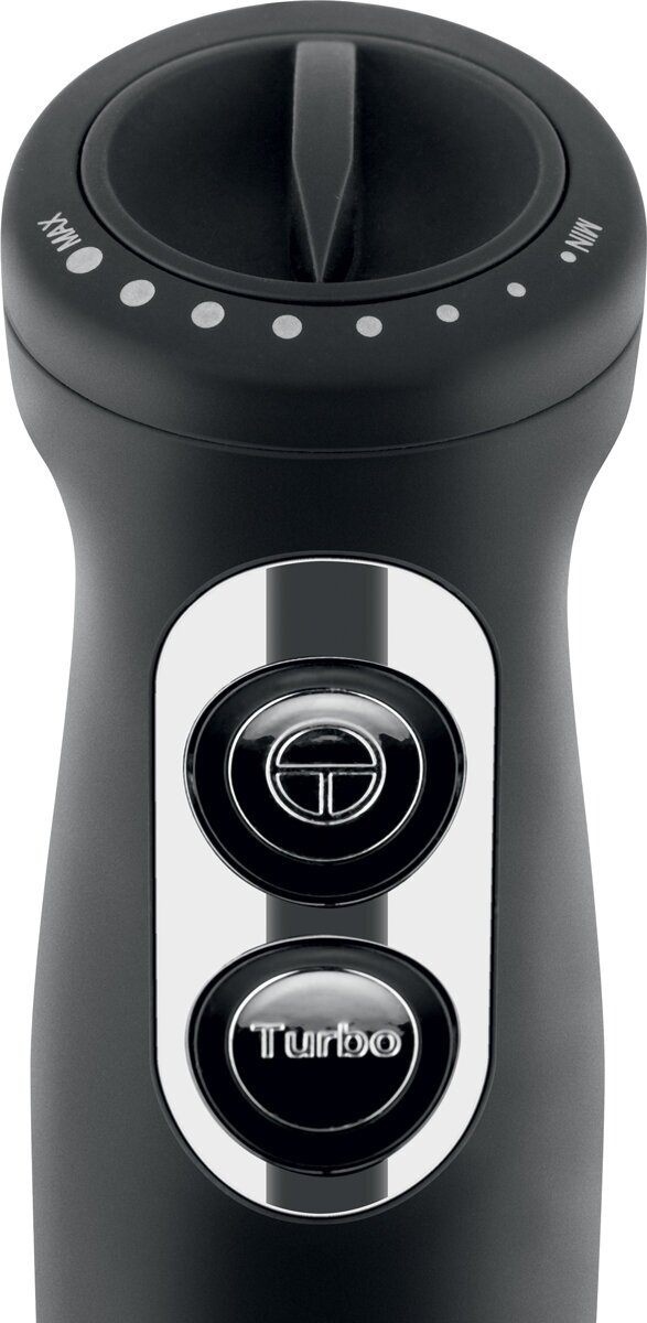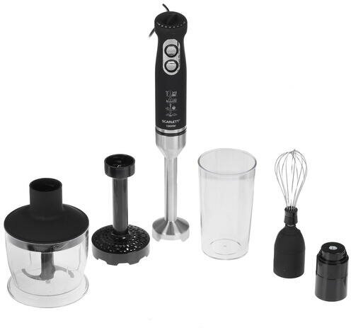 Погружной блендер Scarlett подходит для выполнения любых кухонных работ благодаря возможности плавной регулировки скорости вращения и наличию импульсного режима. Высокая мощность привода позволяет раскалывать с его помощью лёд и измельчать твёрдые продукты. В комплект поставки входит множество сменных инструментов – в том числе насадка для приготовления пюре, венчик для взбивания, универсальный нож и стакан-измельчитель.