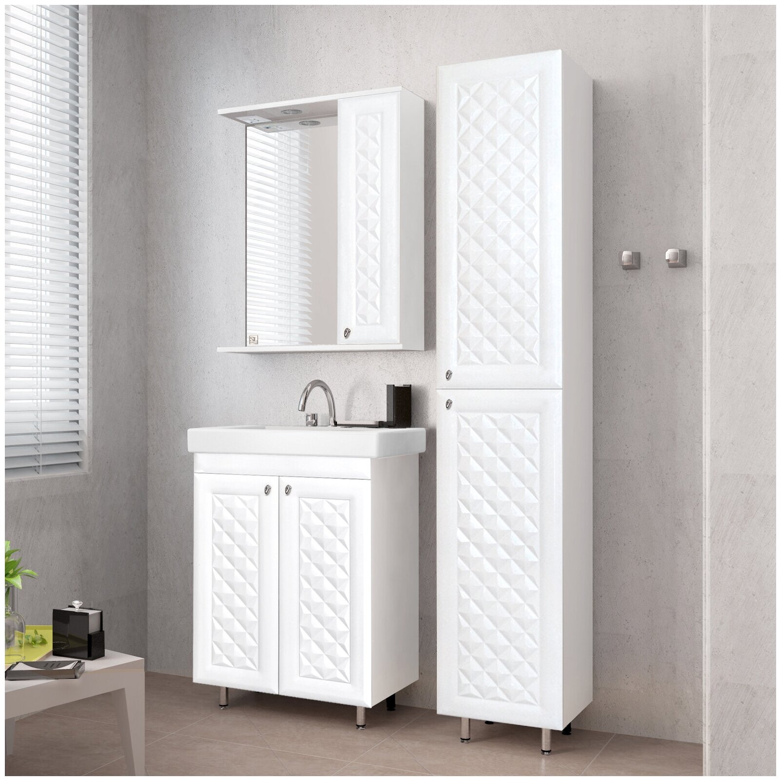 Колонна напольная бренда "Style Line" коллекции "Канна" с современной 3D фрезеровкой фасада, которая придает мебели индивидуальность и особый колорит. Фурнитура - хром, петли на дверцах с механизмом плавного закрывания.
