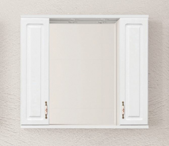 Зеркальный шкаф Style Lineколлекции "Олеандр-2" с подсветкой классического дизайна, декорированный ручками с керамическими вставками "под бронзу" с изящным рисунком. Стеклянные полки с еврокромкой и прозрачными полкодержателями Hefele; лазерная гравировка фирменного логотипа; встроенные светильники в шкафах комплектуются выключателем, розеткой и трансформатором. Высокоточная обработка кромки фацетом 10 мм придает изделию законченный вид и защищает от порезов.
