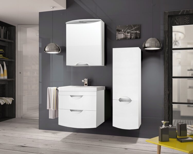 - оснащение: зеркало с подсветкой (встроенный светильник с выключателем, трансформатор, розетка), механизм доводчика для плавного бесшумного закрывания дверцы