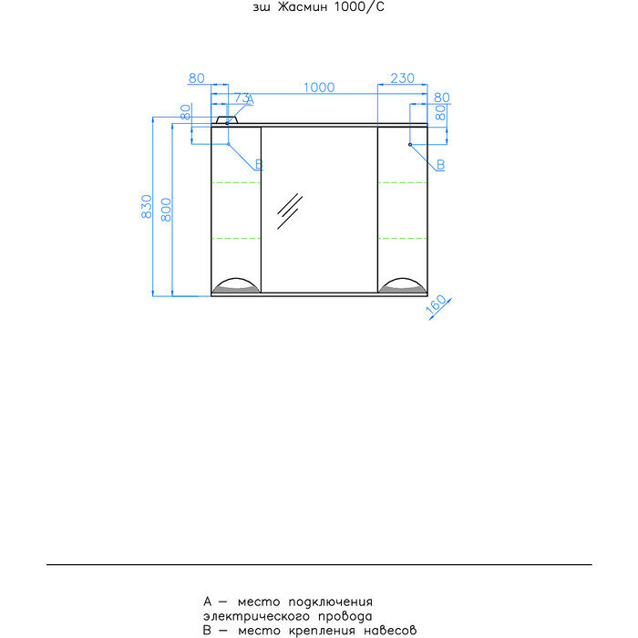 - оснащение: зеркало с подсветкой (встроенный светильник с выключателем, трансформатор, розетка) , крепления, механизм доводчика для плавного бесшумного закрывания дверцы.