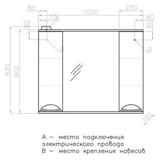 | Оснащение | зеркало с подсветкой, механизм доводчика, зеркало с полочкой, зеркало с розеткой, крепления, зеркало |