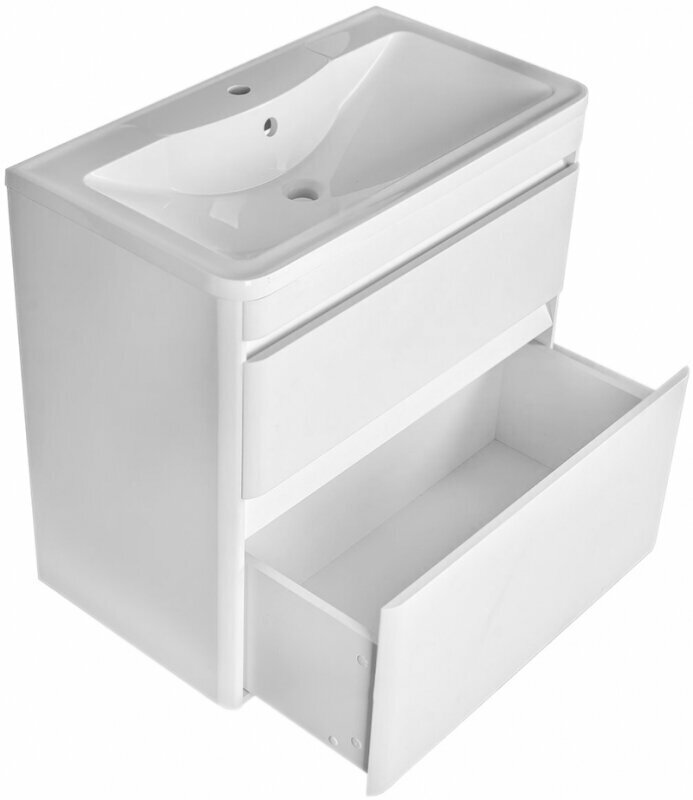 Тумба под раковину на ножках Style Line Атлантика Люкс Plus 80 СС-00000604 с двумя выдвижными ящиками. Предназначена для использования в ванных комнатах с повышенной влажностью. Ящики оснащены доводчиками для плавного закрывания.