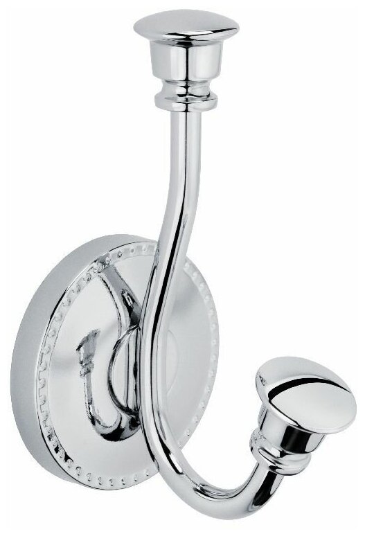 Крючок двойной Adele — стильный и удобный аксессуар для ванной комнаты или кухни. Оригинальные шляпки-наконечники обеспечивают надежную фиксацию полотенец и банных халатов. Крючок изготовлен из стали с глянцевым хромированным покрытием, которое защищает металл от влаги. Для установки на стену или другую вертикальную поверхность предусмотрено винтовое крепление. В комплект поставки включено всё необходимое для монтажа.