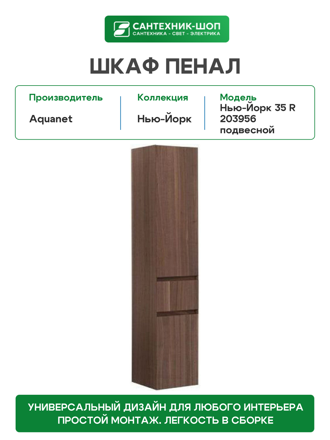Пенал Aquanet Нью-Йорк 35 цвет шпон орех (203956). Две распашные дверцы, один ящик. Правосторонний.