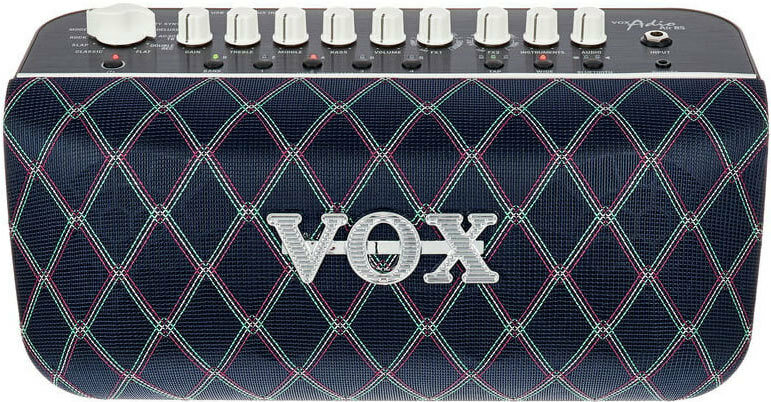 VOX – компактный и лёгкий современный моделирующий усилитель, выдающий впечатляющую для своего размера мощность 50 Ватт с двумя 3-дюймовыми динамиками. Громкий и мощный выходной сигнал этого усилителя превосходит все аналогичные модели в своём классе. Эта модель прекрасно подойдет как для самостоятельных занятий, так и для выступлений. Adio Air BS может моделировать 11 различных усилителей, или 17 с использованием программного обеспечения Tone Room. Предусмотрено два набора эффектов, по 4 эффекта в каждом (или 11 и 8 соответственно с применением Tone Room). Можно использовать до 8 пользовательских настроек - два банка по 4. Дополнительно имеются отключаемые эффекты: Wide Stereo, четырёхступенчатый подавитель шума, а также эквалайзер. Возможности коммутации предусматривают инструментальный вход (джек), вход AUX (джек), разъем для подключения наушников и USB порт. Кроме того, есть возможность беспроводного соединения по Bluetooth, в том числе поддерживается Bluetooth MIDI. Adio Air BS может работать автономно от 8 батарей АА. В комплекте поставляется адаптер переменного тока и кабель для подключения к электросети, а также карта для загрузки ПО JamVOX III. Вес модели – 2,9 кг.