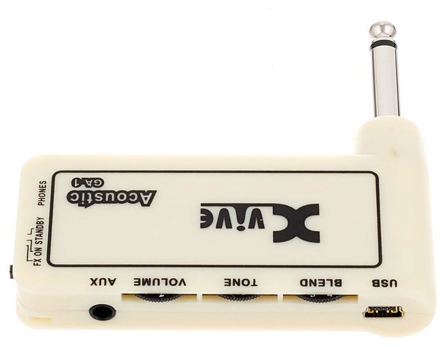 XVIVE GA-1 Acoustic Amplug – миниатюрный усилитель для наушников, оптимизированный для использования с акустическими гитарами. Это компактное устройство, которое легко поместится в кармане, позволяет подключить инструмент напрямую к наушникам, чтобы можно было играть на гитаре в любом месте и в любое время, не беспокоя окружающих. Микро-усилитель оснащен штекером моно ¼ джек для подключения к выходному разъему гитары и разъемом стерео мини-джек для наушников. Для настройки звука предусмотрены регуляторы громкости, Tone и Blend. Переключатели: STANDBY / ON(Warm) / FX(Bright). Для того, чтобы можно было играть под аккомпанемент любимых композиций, имеется вход AUX (3,5 мм мини-джек) для подключения плееров и других воспроизводящих устройств. Зарядка микро-усилителя осуществляется через разъем мини USB. Кабель для зарядки поставляется в комплекте. Вес XVIVE GA-1 Acoustic Amplug – всего 40 г. Габариты: 79,5 мм х 75,5 мм, толщина – 15,5 мм.
