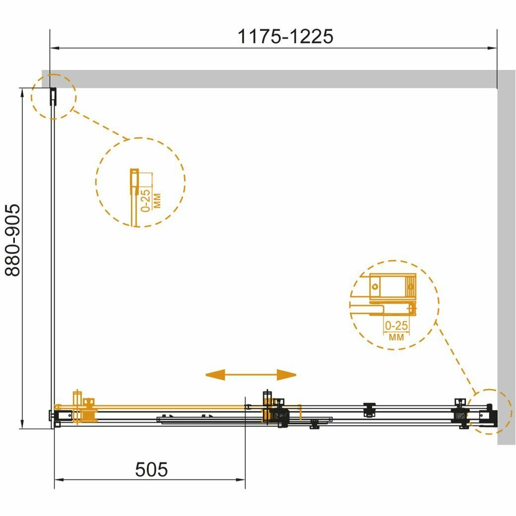 Душевой уголог: прямоугольный. Тип дверей: одна раздвижная дверь. Стекло: 8 мм, прозрачное. Исполнение: хром. Поддон: тип АН, А или барьер. Поддон или барьер приобретается отдельно. Особенности: подвижные ролики плавно скользят по металлическим направляющим.
