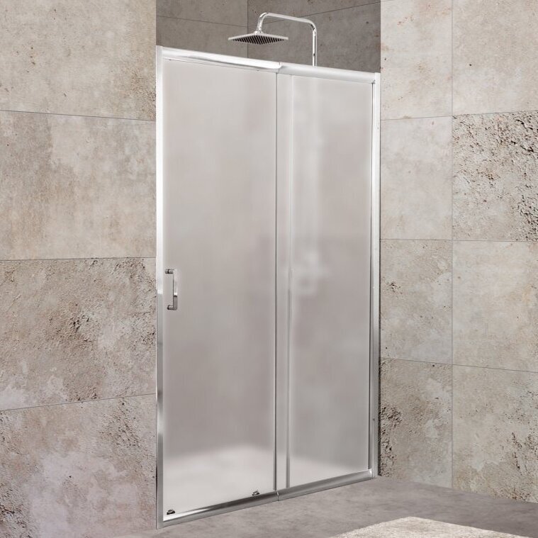 Раздвижная душевая дверь Бельбаньо Уно имеет две раздвижные створки, профиль выполнен из анодированного алюминия, стандарт DIN17611 2007, цвет хром. Полотно двери выполнено из рифленого закаленного стекла толщиной 5 мм и крепится на двойные подшипниковые ролики. Ручка выполнена из нержавеющей стали.