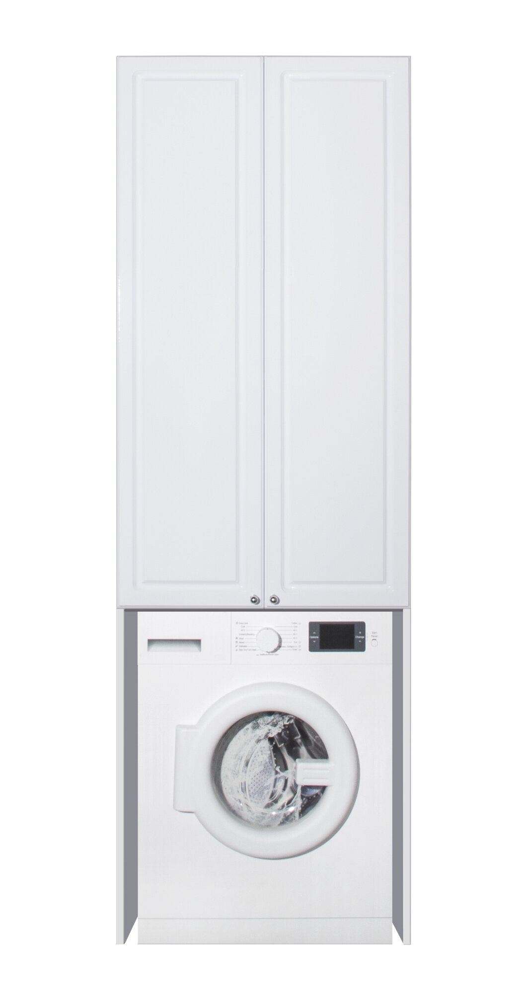 Высокая конструкция со встроенным двустворчатым шкафом, оборудованным вместительными широкими полками, предусматривает внизу нишу для встройки бытовой техники. Корпус пенала изготавливается из влагоустойчивого МДФ с пленочным покрытием, придающим поверхности привлекательный внешний вид. Монтируется над стиральной машиной.