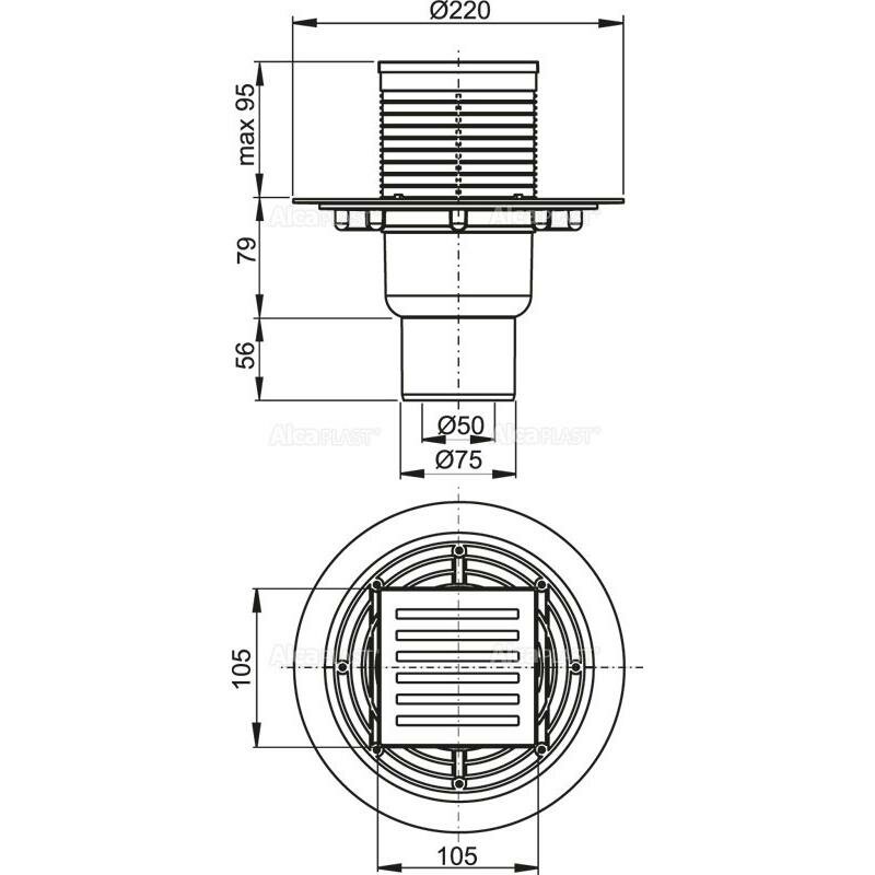 Сливной трап 105 105/50/75, подводка прямая, решетка латунь-хром, гидрозатвор мокрый. Регулируемая по высоте горловина 995 мм. Широкий изоляционный воротник для удобного монтажа укладочной гидроизоляции пола. Прямое подключение к канализационному стоку 50/75 мм. Вручную легко чистящийся сифон, вплоть до сточной трубы. Мокрый гидрозатвор надежно защищает от проникновения запаха из канализации. Совместимость с другими составными частями сливного трапа, включительно мокрого, сухого и комбинированного гидрозатвора SMART. Материал: полипропилен, устойчивый к механическим, химическим и термическим повреждениям. Материал: нержавеющая сталь AISI 304, DIN 1.4301