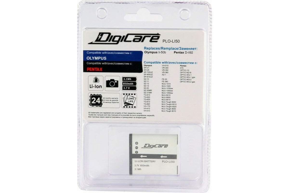Digicare - современный, небольшой и легкий аккумулятор. Он обладает достаточно быстрым процессом зарядки и рассчитан на продолжительное использование. Аккумулятор не имеет эффекта памяти и быстро восстанавливает свою работоспособность даже после глубокого разряда. Батарея является аналогом для элементов питания Olympus LI-50B, Pentax D-LI92.