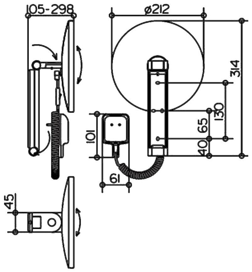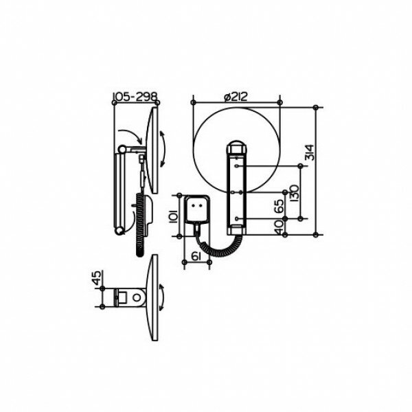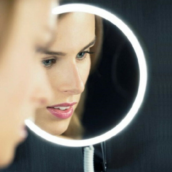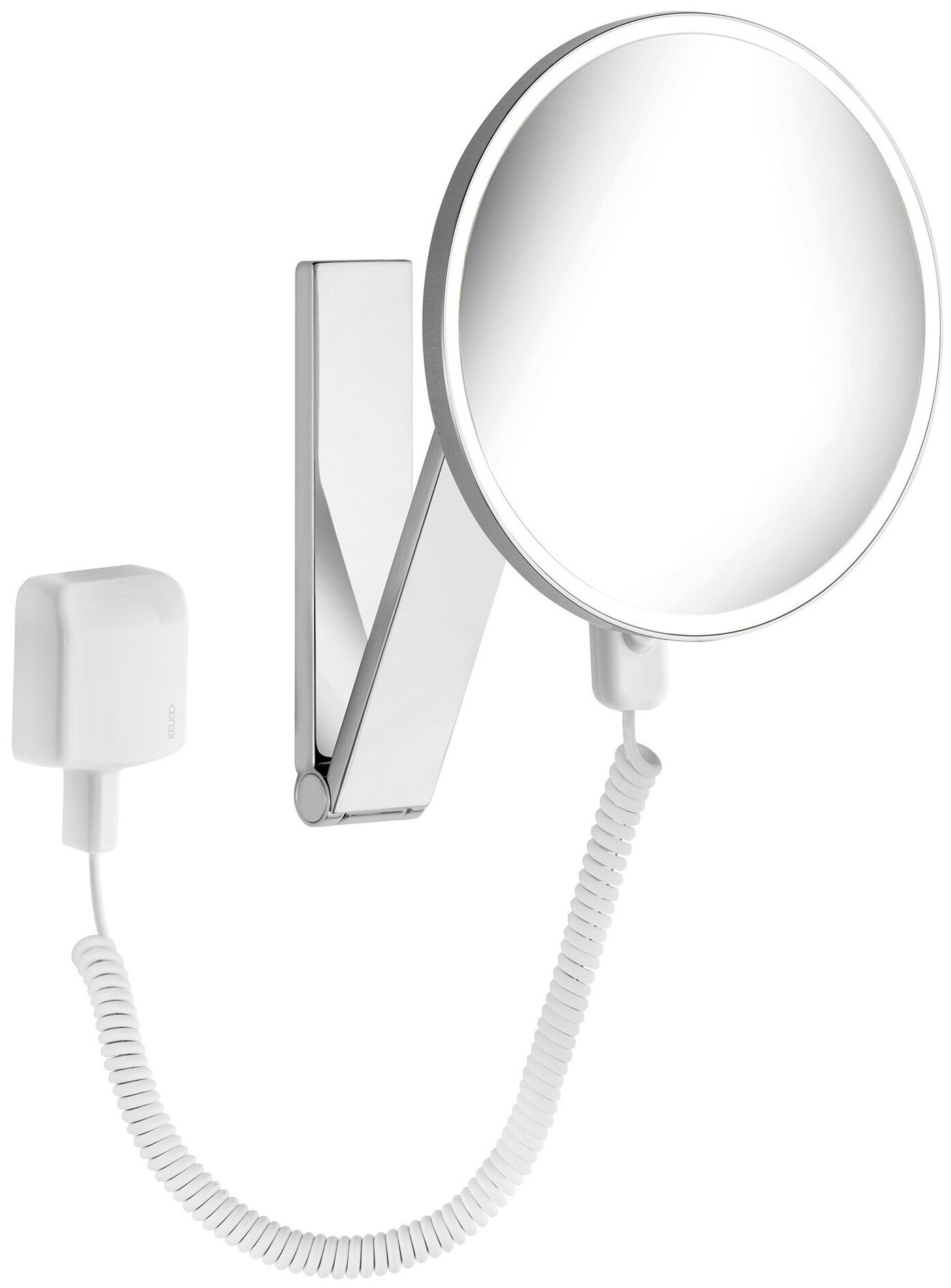 Зеркало косметическое с подсветкой (1 x 4,5 Вт светодиод), круглое, настенная модель на кронштейне с шарниром, подсоединение к электропитанию через трансформатор со штекером (100-240 B), со спиралевидным кабелем (400 мм) и выключателем, фактор увеличения x 5. Цвет хром.