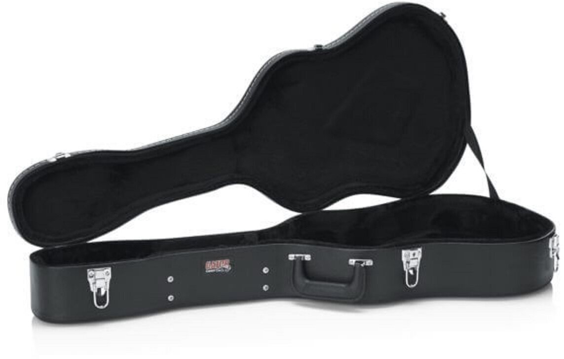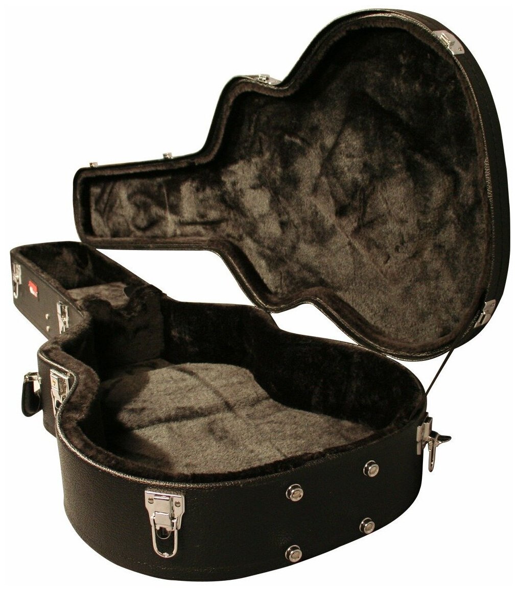 GATOR GW-CLASSIC – высококачественный кейс для классических акустических гитар, выполненный из прочной листовой фанеры премиального качества. Модель рассчитана на гитары с корпусом глубиной до 127 мм, длина инструмента – до 104 см, ширина в нижней части – до 394 мм, в верхней части – до 292 мм. Слой пены обеспечивает дополнительную защиту от механических повреждений. Кейс оснащен прочной ручкой эргономичной формы для переноски в руке и тремя надежными защелками с замками, запирающимися на ключ. Внутренняя поверхность кейса имеет мягкую плюшевую отделку для защиты поверхности инструмента от потертостей и царапин. Гриф плотно фиксируется в специальном углублении. Внутри кейса предусмотрен отсек для размещения аксессуаров. Модель имеет стильный внешний вид, представлена в черном цвете с черной внутренней отделкой, контрастной белой строчкой и блестящей хромированной фурнитурой. Вес кейса – 4,9 кг.