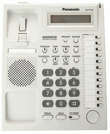 Системный телефон Panasonic KX-T7730 предназначается для работы с аналоговыми разнотипными АТС Panasonic и является нужным изделием для офиса либо рабочего кабинета. Телефон выполнен в классическом дизайне без особых излишеств. Это положительным образом сказалось на его цене, сделав ее доступной для каждого. Panasonic KX-T7730 оснащен дисплеем на одну строку, которого вполне достаточно для полноценной и приятной эксплуатации. Гнездо для гарнитуры стандартного типа позволяет подключить к данному телефону современные наушники. 12 удобных клавиш приятны на ощупь и легко нажимаются, издавая при этом характерный звук.