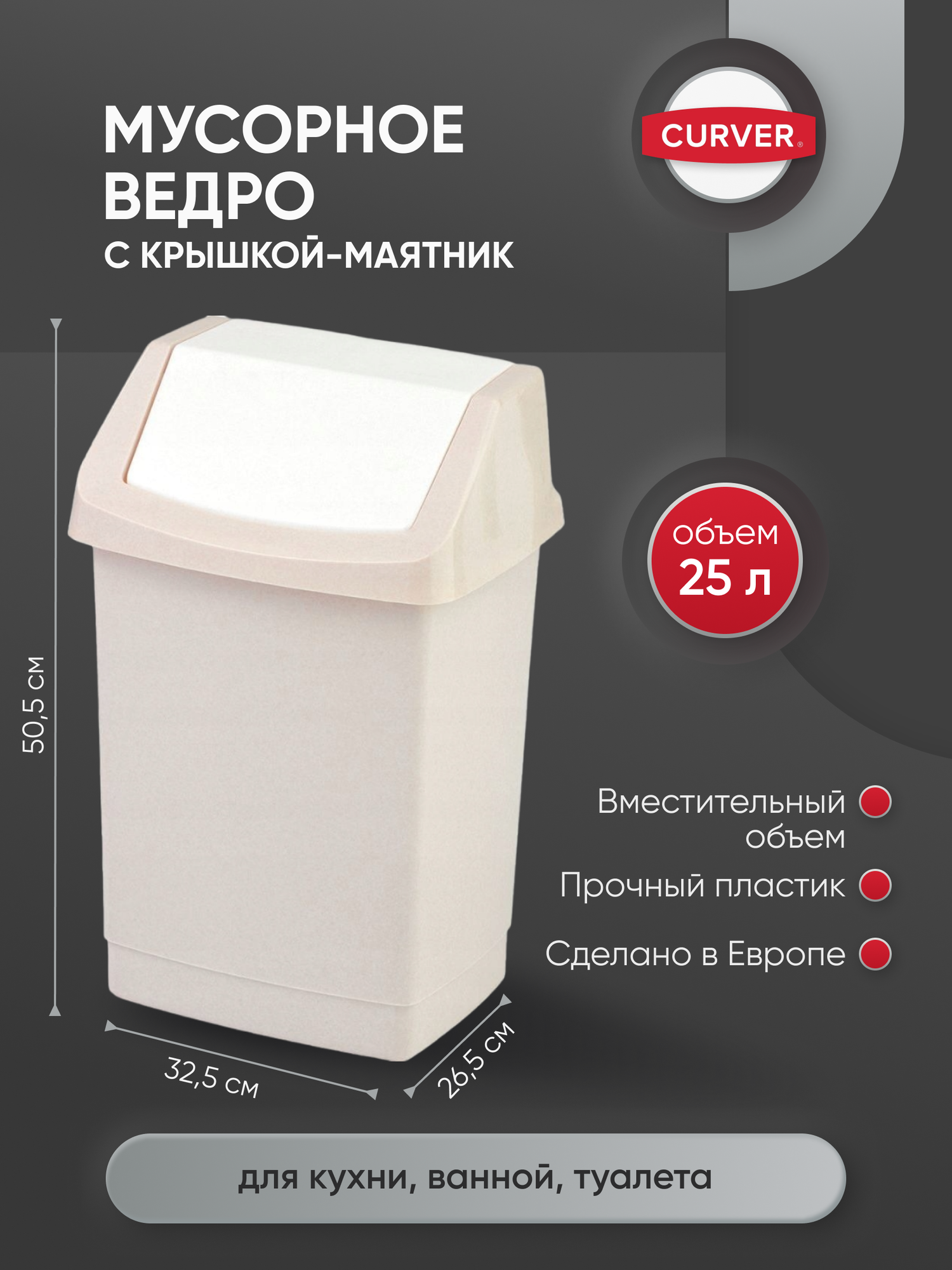 Контейнер для мусора Curver CLICK IT вместимостью 25 литров идеально подходит для помещений, где вам нужна функциональная урна для мусора. Прекрасно подходит для размещения в ванной комнате, на кухне или в офисе. Отличается прочностью, что гарантирует долговечность. Поворотная крышка контейнера открывается очень легко: достаточно просто качнуть ее рукой. После выбрасывания мусора крышка контейнера возвращается на свое место, обеспечивая удобство ежедневного использования.