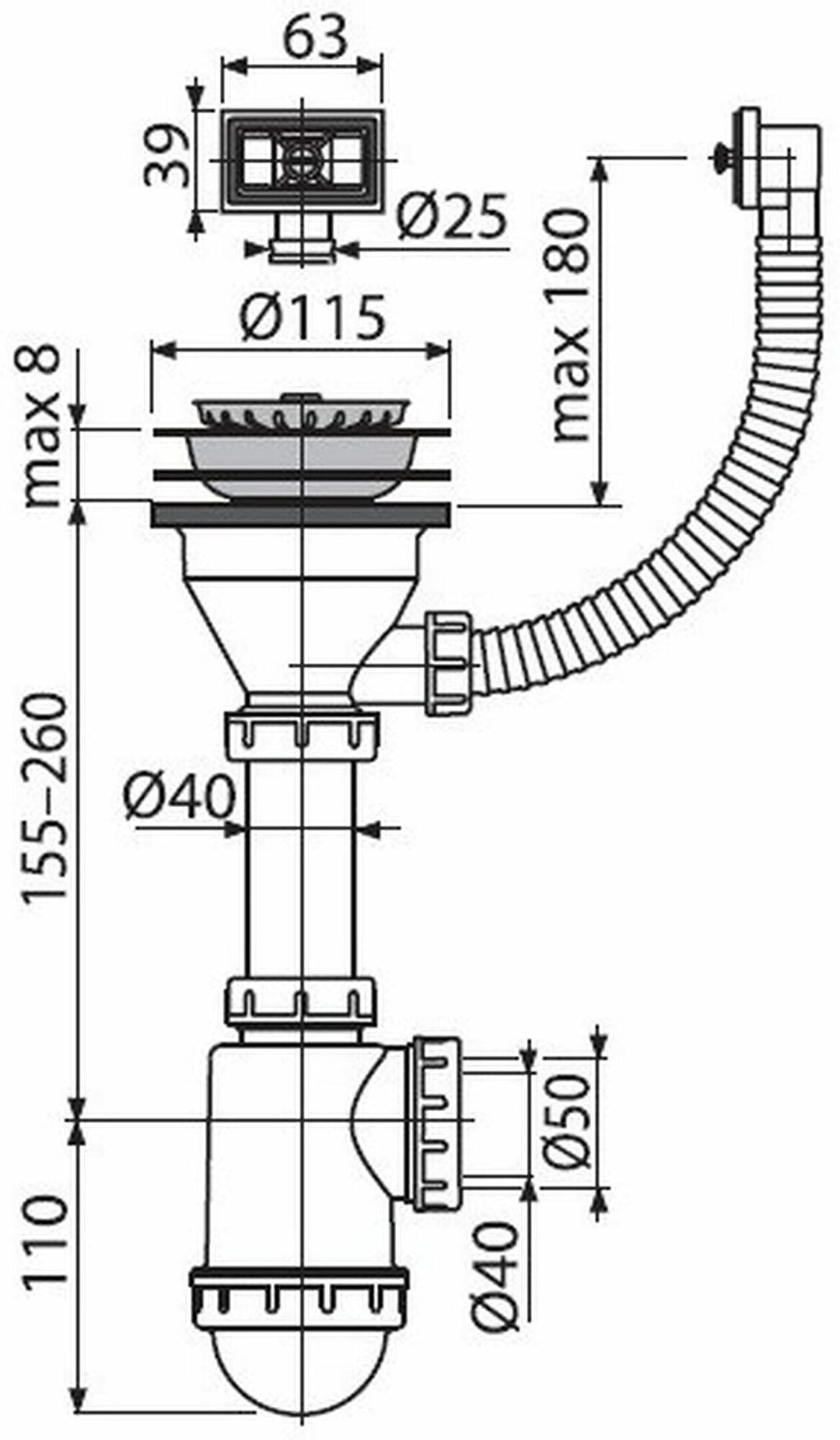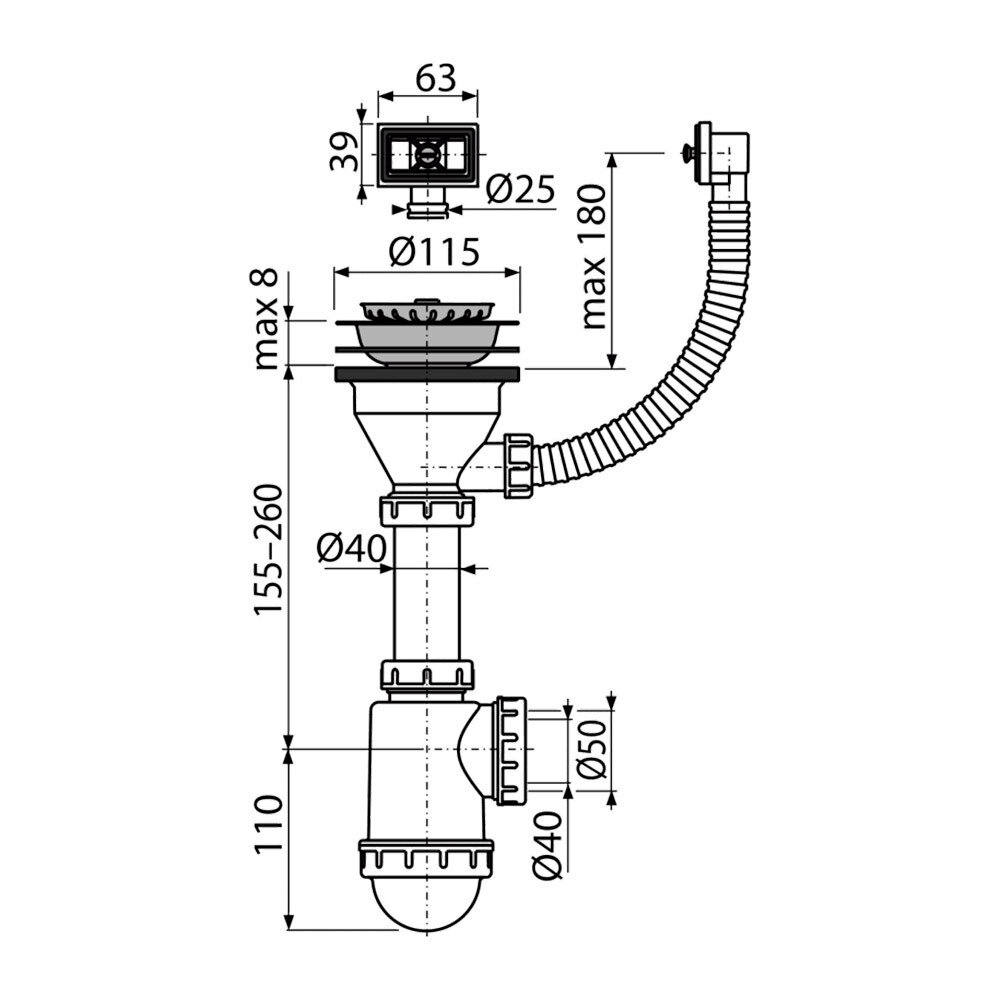 Сифон Сифон с переливом Alcaplast A447 с нержавеющей решеткой D115 и гофропереливом D-50/40 Для кухонных моек с отверстием слива 90 мм Сливная решетка из нержавеющей стали Сетка сливного отверстия служит пробкой Скорость стока воды 44 л/мин. Материал: полипропилен Вид сифона для раковины (биде): бутылочный Направление выпуска сифона: горизонтальное Особенности: с большой горловиной и переливом Диаметр пробки слива, мм: 115 Подключение к канализации, мм: 40/50 Посадочный (установочный) диаметр для сифона, мм: 90