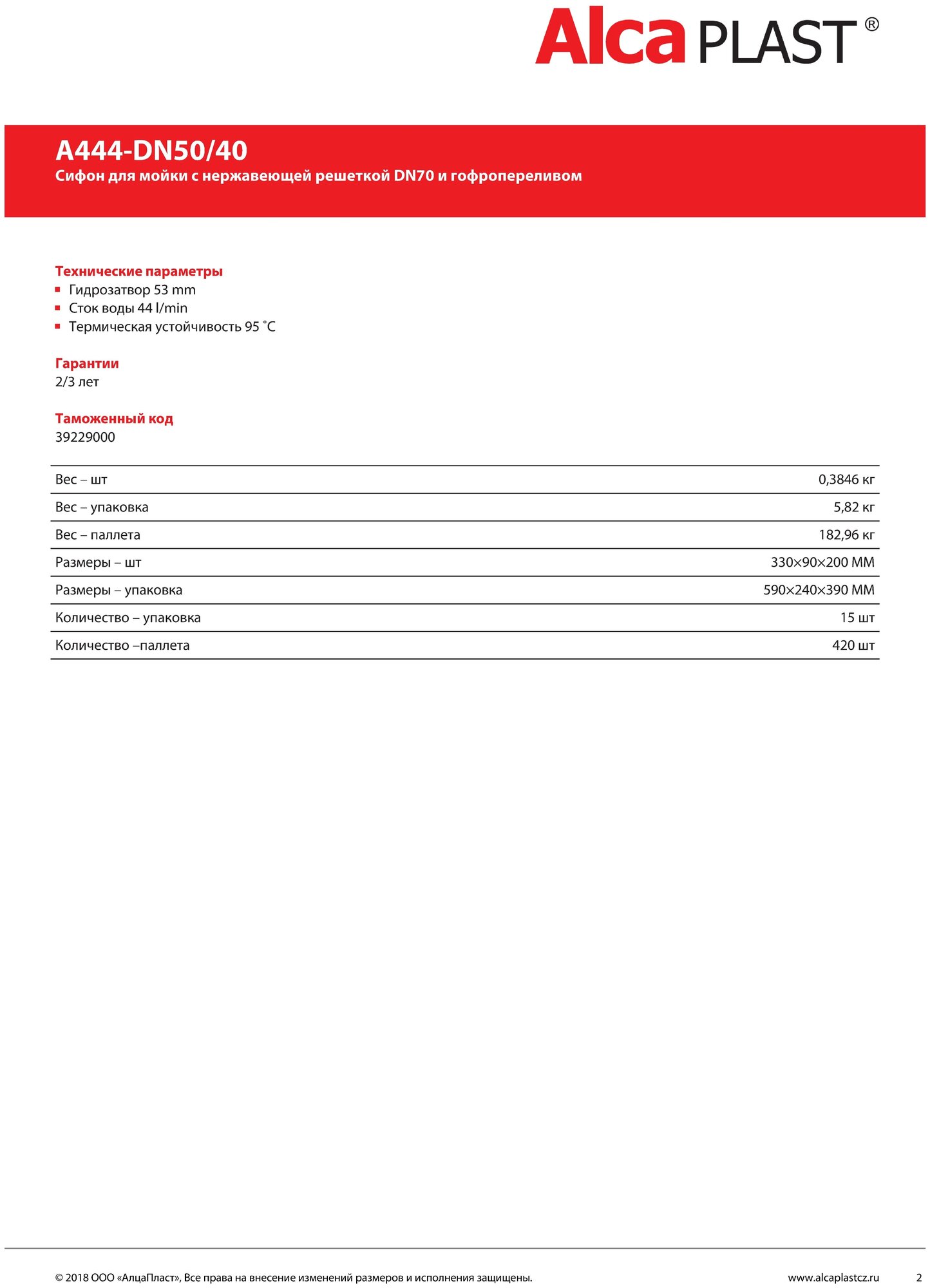 Сифон для кухонной мойки Alcaplast A444-DN50/40 изготавливается из высококачественных материалов.