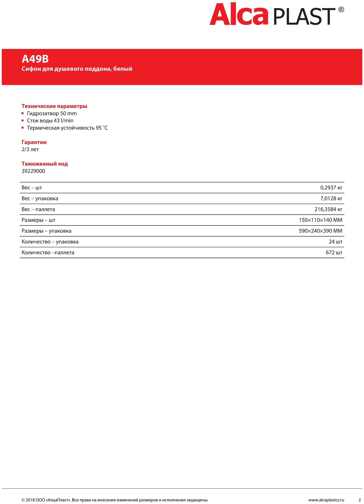 Сифон для душевого поддона Alcaplast A49B изготавливается из высококачественных материалов.