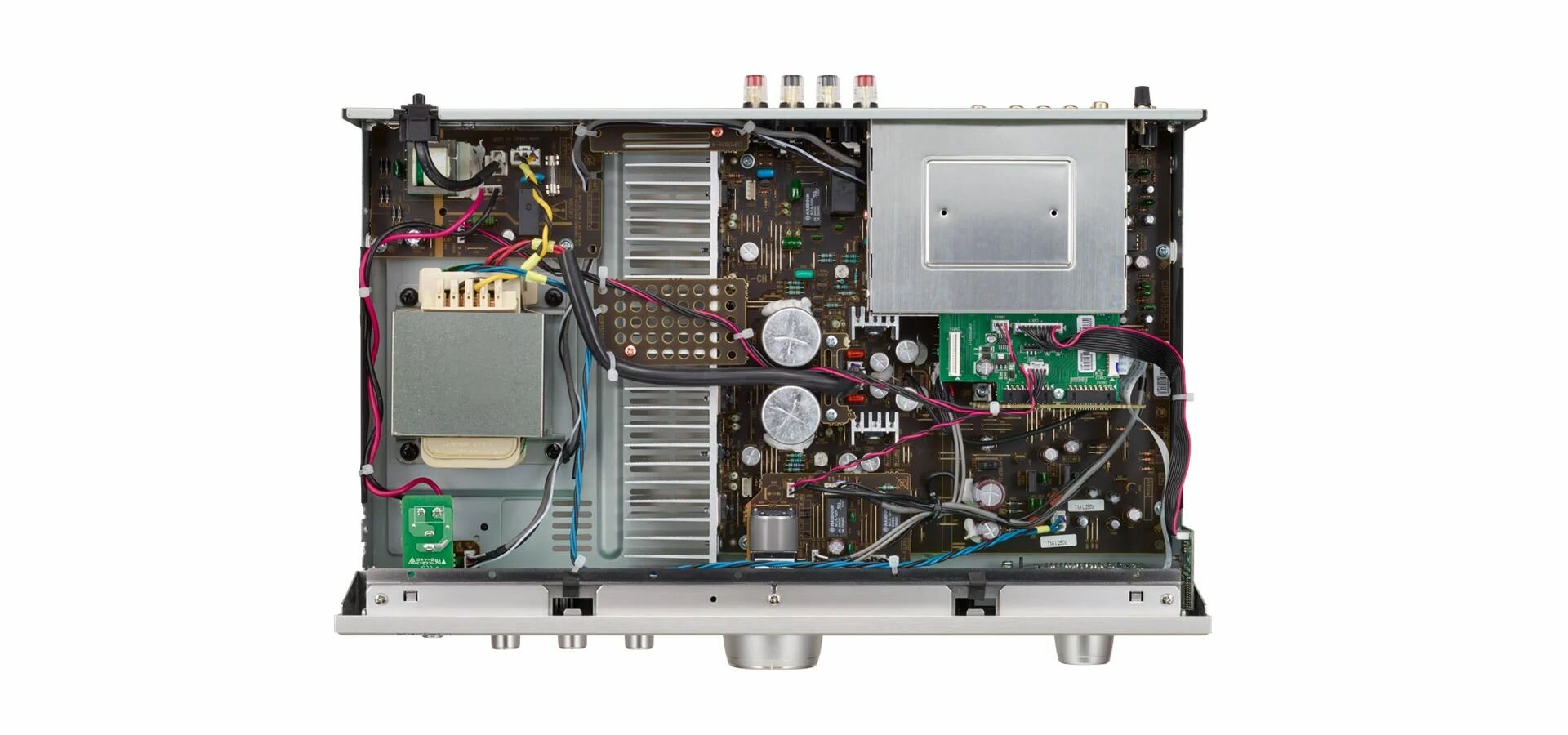 В усилителе Denon PMA-600NE используются сильноточные выходные полевые транзисторы и аппарат развивает до 70 Вт мощности на канал. Фирменная технология динамического питания и транзисторы AHC, использованные в схеме, обеспечивает значительный выходной ток и стабильную работу усилителя даже со сложной нагрузкой. В блоке питания Denon PMA-600NE установлен трансформатор с раздельными обмотками для питания различных схем аппарата. В сочетании с конструкцией разделения разноуровневых сигналов внутри усилителя SLDC это обеспечивает устранение взаимных помех между схемами и снижение искажений. В схеме усилителя используются отборные компоненты аудиофильского класса.