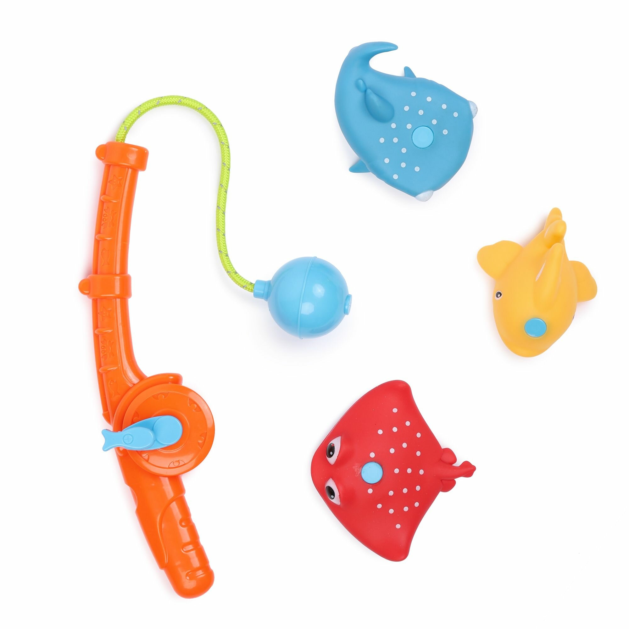 Игровой набор для ванной, в который входят удочка с текстильной леской и магнитом для ловли, катушка-трещотка и 3 разноцветных рыбки. Игрушки подойдут для игр в ванной и не будут тонуть.