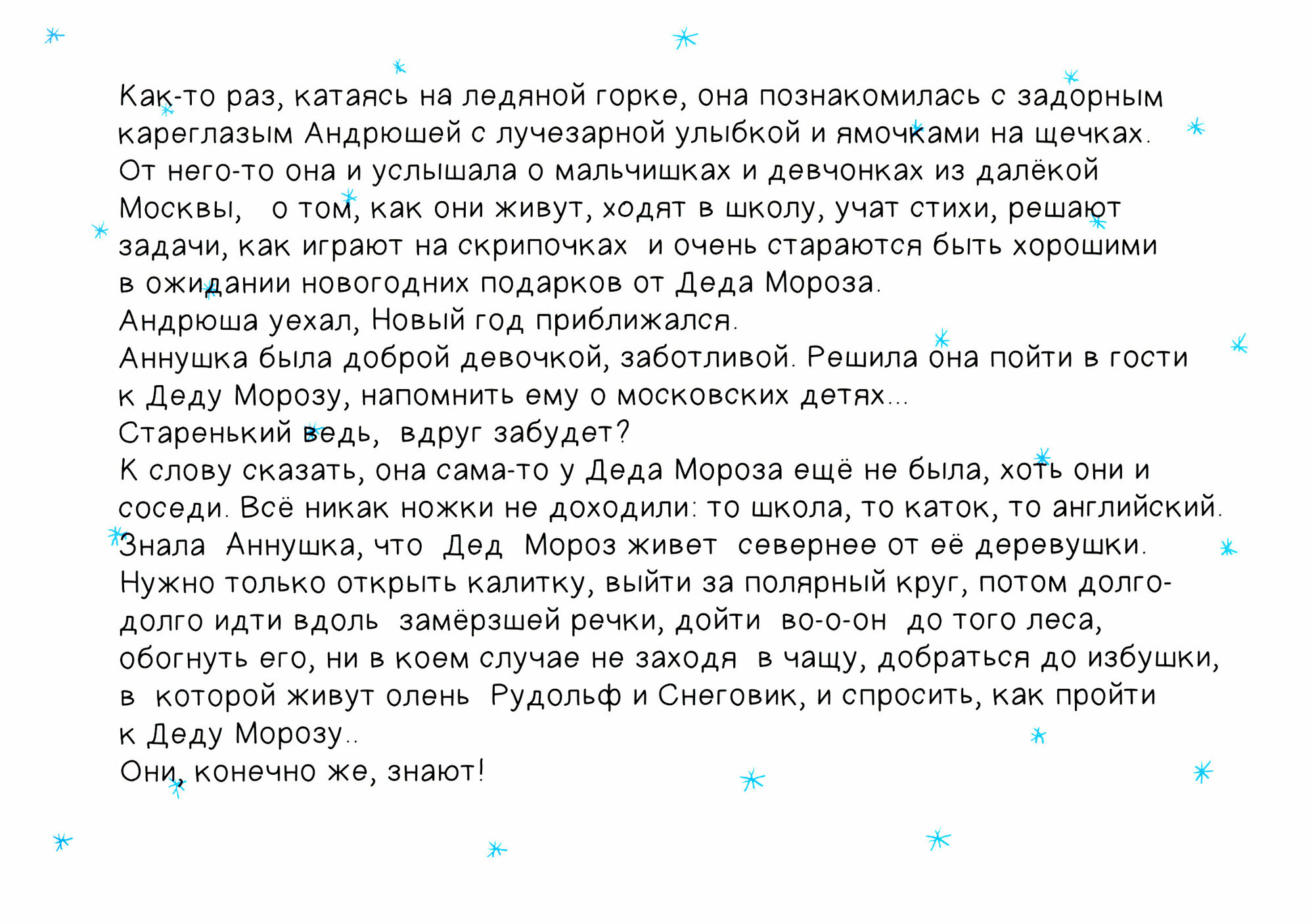 Все Новогодние сказки похожи друг на друга. Заканчиваются они счастливо, но все по-разному. В книге Александры Кремер-Хомасуридзе главная героиня - маленькая Аннушка. Настолько маленькая, что иногда читатель с интересом ищет ее на фото. На фото? почему на фото? Да потому что эта новогодняя сказка необычная: помимо рисунков Марики Острив, тут есть и прекрасные фото. Это фотосказка!