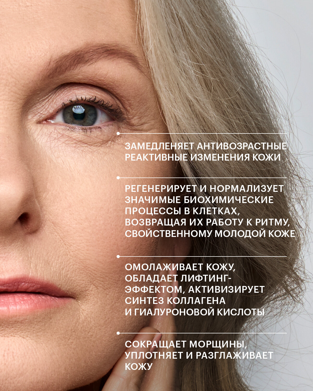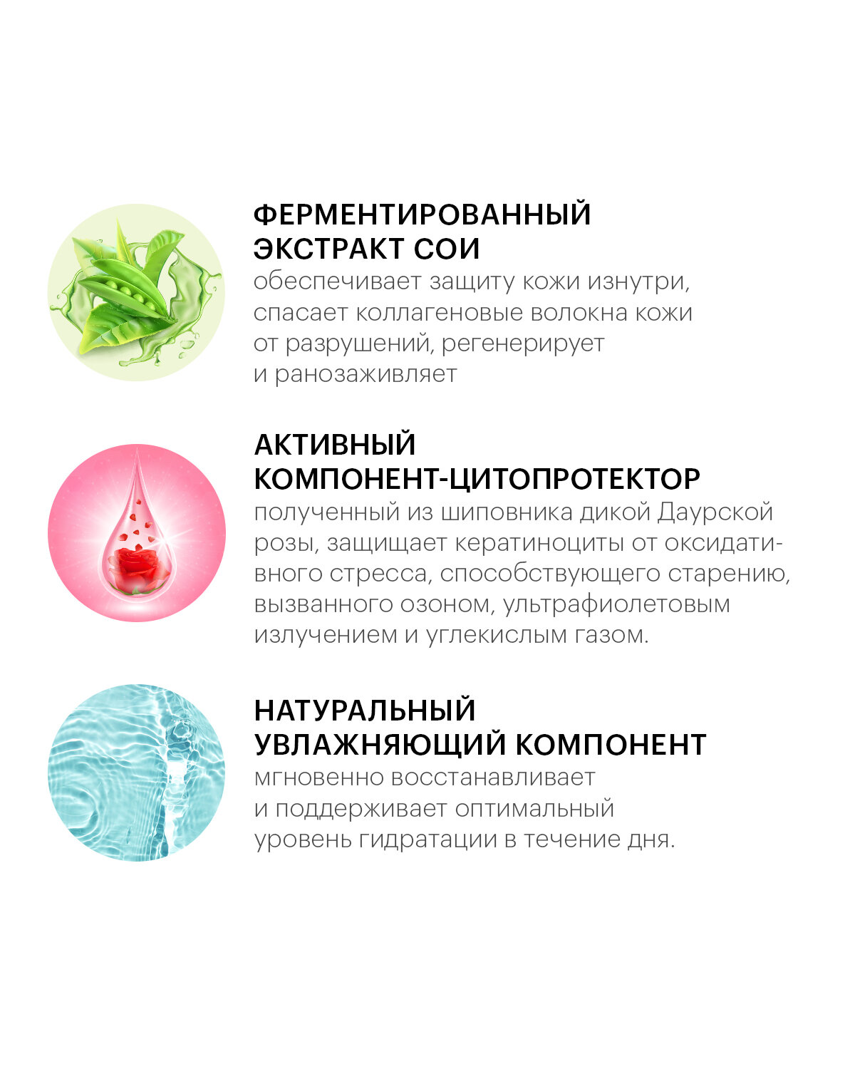 Нежная, быстро впитывающая текстура является отличной основой под макияж. Разработан для идеального ухода за сухой кожей в течение дня. Комплекс нейрокосметических компонентов поддерживает клеточный и энергетический метаболизм клеток, воссоздает и перезагружает в коже связи, способствует сокращению межбровных морщин, носогубных складок, морщин «марионеток», а также «гусиных лапок» после 8 недель применения. * *подтверждено в ходе клинических испытаний АКТИВНЫЕ ИНГРЕДИЕНТЫ: [+] Гидролат Дамасской розы освежает и омолаживает кожу. Улучшает микроциркуляцию, избавляя от застойных явлений. Активизирует защиту от свободных радикалов. [+] Экстракт дикой Даурской розы запускает процесс обмена веществ, направленный на восстановление поврежденной, возрастной кожи. Защищает клетки кожи (кератиноциты) от действия озона, ультрафиолета и углекислого газа, благодаря активации антиоксидантной системы. [+] Новейший липопептид активно борется с клеточным старением. Активизирует синтез коллагена I, III, IV, VI типов, улучшает метаболизм восстанавливает связь между ядром и внутриклеточным матриксом. [+] Запатентованный стимулятор выработки гиалуроновой кислоты - необходимый субстрат для воссоздания новых молекул гиалуроновой кислоты, нормализует синтез собственной гиалуроновой кислоты, уплотняет и разглаживает кожу. [+] Ферментированный экстракт сои – источник изофлавонов и витаминов в биодоступной форме. Подавляет выработку коллагеназы, спасая коллагеновые волокна кожи от разрушений. [+] Натуральный увлажняющий компонент мгновенно восстанавливает и поддерживает оптимальный уровень гидратации кожи в течение дня. ТЕКСТУРА: Роскошная текстура быстро впитывается, не оставляет жирного блеска и ощущения пленки. Изысканный аромат крема раскрывается на коже, превращая ритуал ухода в удовольствие. ПЕРЕНОСИМОСТЬ: • Не раздражает кожу • Не пересушивает кожу • Не содержит парабенов Применение: Ежедневно утром легкими массажными движениями наносить небольшое количество крема тонким слоем на тщательно очищенную кожу лица, шеи и области декольте.