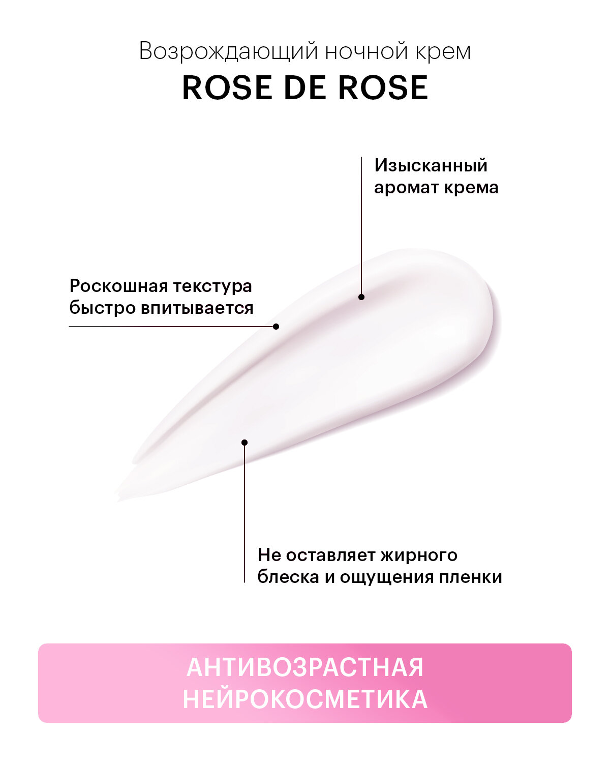 Ночной возрождающий крем ROSE DE ROSE создан остановить стремительные изменения качества кожи, связанные с возрастом. А именно укрепляет, подтягивает, разглаживает кожу, возвращая ей упругость и эластичность. Гидролат Дамасской розы в составе формулы насыщает кожу антиоксидантами, защищая ее от старения, освежает и омолаживает кожу. Экстракт стволовых клеток эдельвейса восстанавливает сократительную способность кожи и ее упругость, за счет чего кожа наполняется энергией. Липопептид борется с клеточным старением, активизирует синтез коллагена. Ферментированный экстракт сои - источник изофлавонов и витаминов в биодоступной форме, участвует в сохранении коллагеновых волокон кожи от разрушений. Роскошная текстура быстро впитывается, не оставляет жирного блеска и ощущения пленки. Способ применения: легкими массажными движениями наносите небольшое количество крема тонким слоем на тщательно очищенную кожу лица ежедневно за 1,5-2 часа до сна.