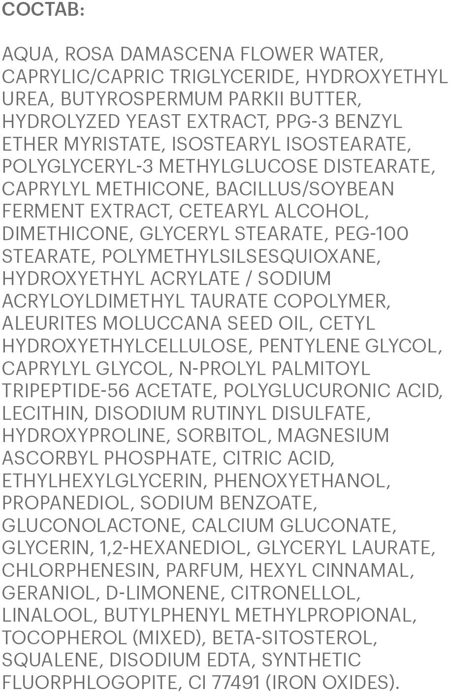 | Состав | Aqua, Rosa Damascena Flower Water,Caprylic/Capric Triglyceride, Hydroxyethyl Urea, Butyrospermum Parkii Butter,Hydrolyzed Yeast Extract, PPG-3 Benzyl Ether Myristate, Isostearyl Isostearate, Polyglyceryl-3 Methylglucose Distearate, Caprylyl Methicone, Bacillus/Soybean Ferment Extract, Cеtearyl Alcohol, Dimethicone, Glyceryl Stearate, PEG-100 Stearate, Polymethylsilsesquioxane, Hydroxyethyl Acrylate / Sodium Acryloyldimethyl Taurate Copolymer, Aleurites Moluccana Seed Oil, Cetyl Hydroxyethylcellulose, Pentylene Glycol, Caprylyl Glycol, N-Prolyl Palmitoyl Tripeptide-56 Acetate, Polyglucuronic Acid, Lecithin, Disodium Rutinyl Disulfate, Hydroxyproline, Sorbitol, Magnesium Ascorbyl Phosphate, Citric Acid, Ethylhexylglycerin, Phenoxyethanol, Propanediol, Sodium Benzoate, Gluconolactone, Calcium Gluconate, Glycerin, 1,2-Hexanediol, Glyceryl Laurate, Chlorphenesin, Parfum, Hexyl Cinnamal, Geraniol, D-Limonene, Citronellol, Linalool , Butylphenyl Methylpropional, Tocopherol (mixed), Beta-Sitosterol, Squalene, Disodium EDTA, Synthetic Fluorphlogopite, CI 77491 (Iron Oxides). |