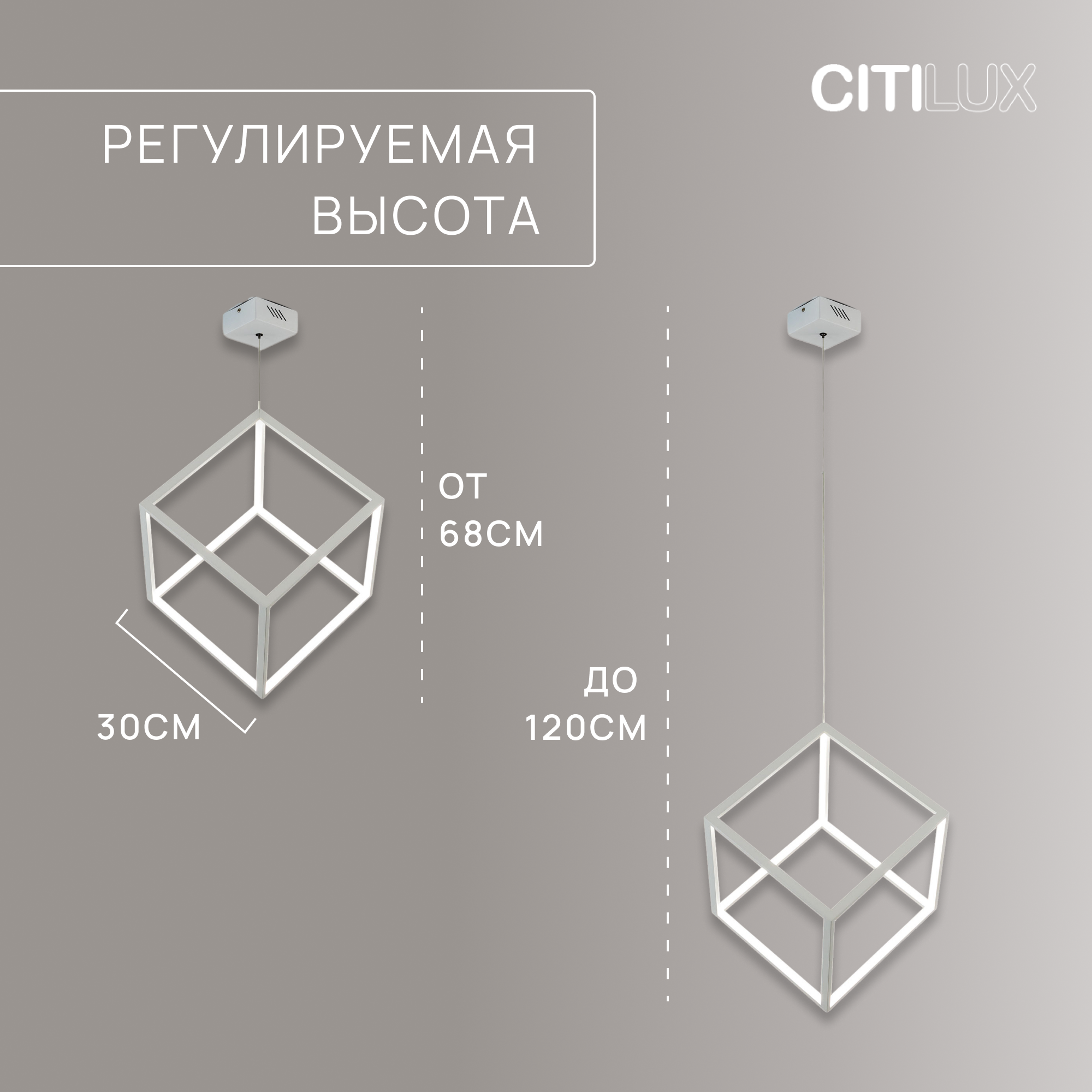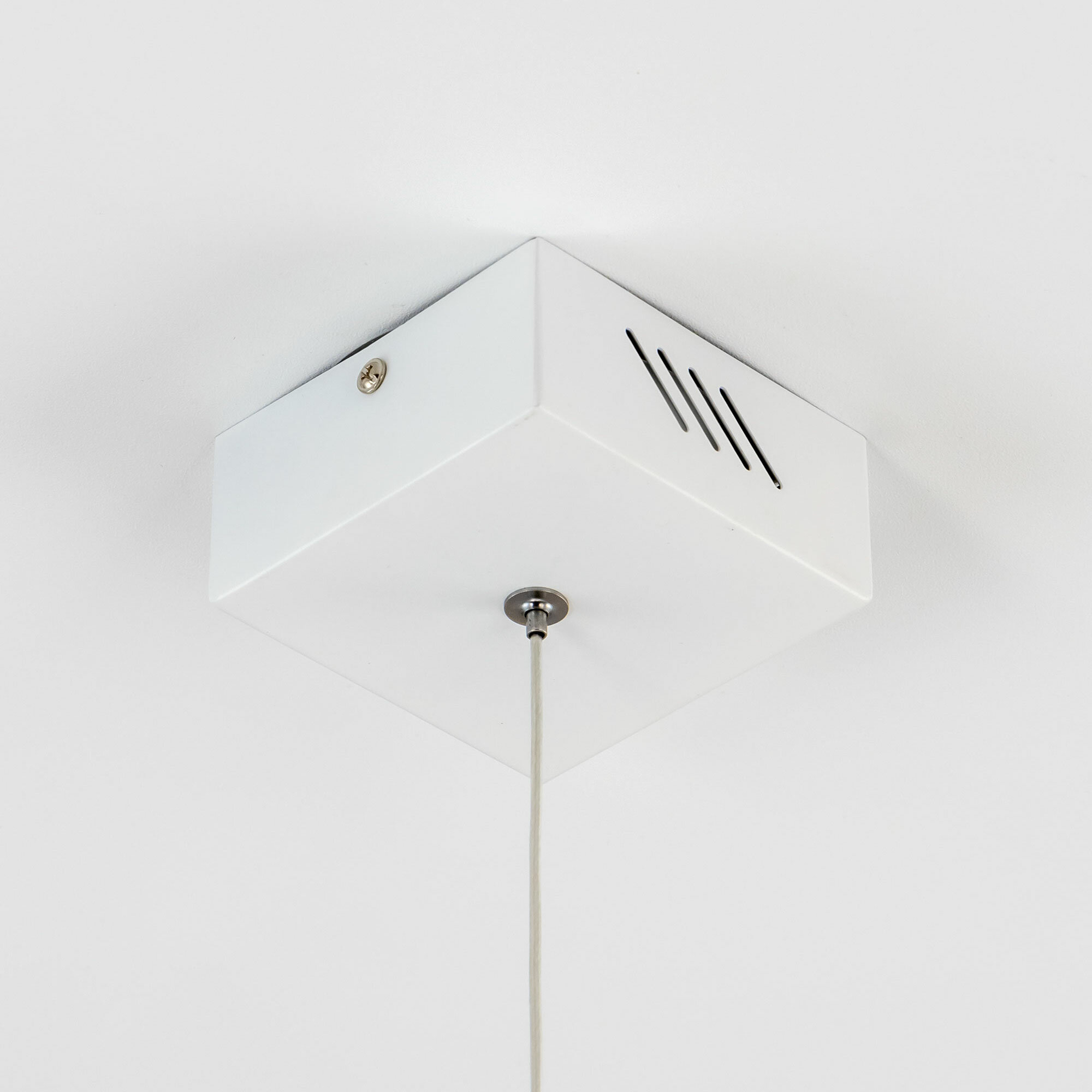 Светящийся куб, подвешенный на тонком серебристом тросе — оригинальное решение для современного интерьера, оформленного в стиле хай-тек. Кажется, что многогранник свободно парит в воздухе, наполняя пространство мягким, приятным для глаз рассеянным светом. Основание модели выполнено из окрашенного металла, плафон — из оптического полимера. В качестве источника используются встроенные в конструкцию светодиоды с долгим сроком службы. Цветовая температура излучения 4000 К, что соответствует естественному белому свету. Есть возможность регулировать высоту троса.