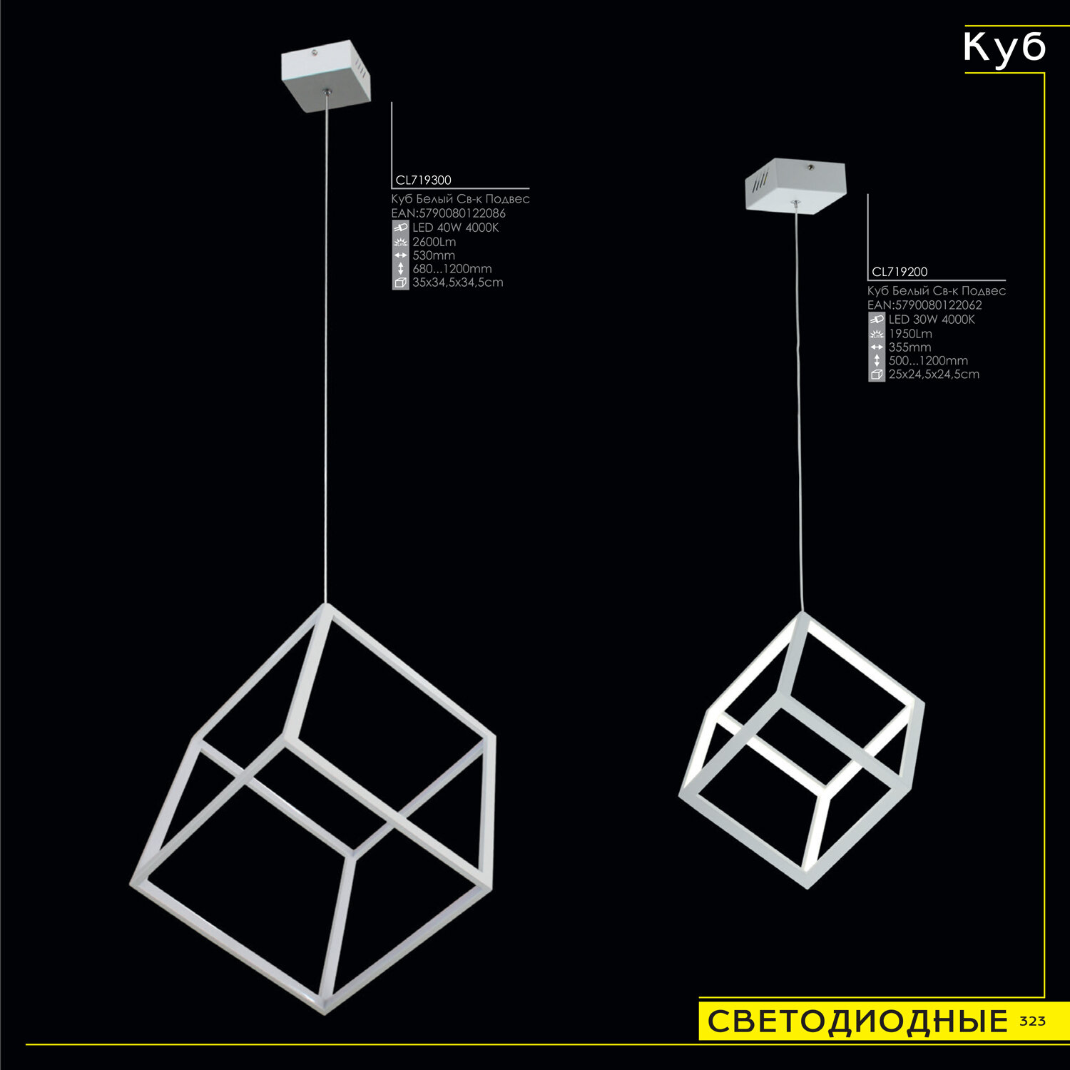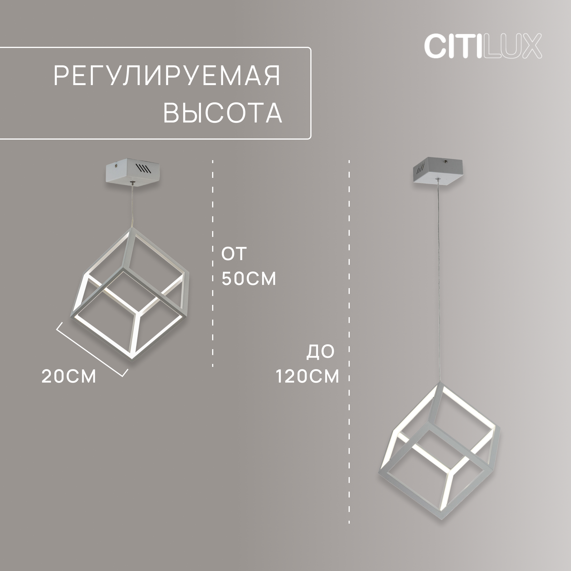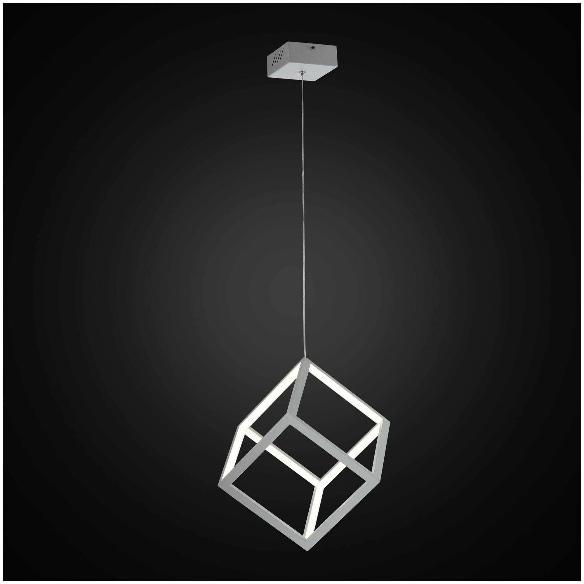 Светящийся куб, подвешенный на тонком серебристом тросе — оригинальное решение для современного интерьера, оформленного в стиле хай-тек. Кажется, что многогранник свободно парит в воздухе, наполняя пространство мягким, приятным для глаз рассеянным светом. Основание модели выполнено из окрашенного металла, плафон — из оптического полимера. В качестве источника используются встроенные в конструкцию светодиоды с долгим сроком службы. Цветовая температура излучения 4000 К, что соответствует естественному белому свету. Есть возможность регулировать высоту троса.