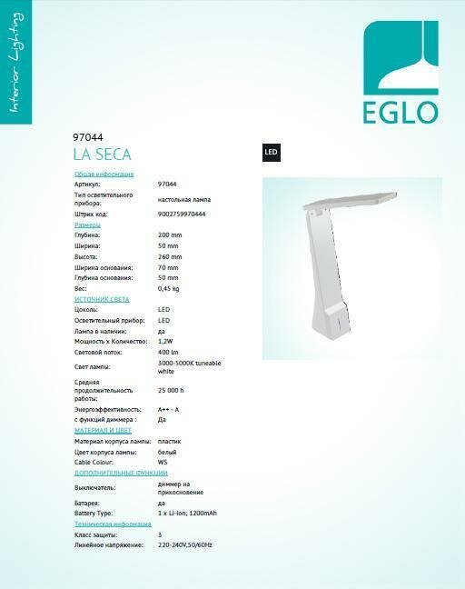 - Настольная лампа EGLO 95945 (EGLO 97045 LA SECA) обзор