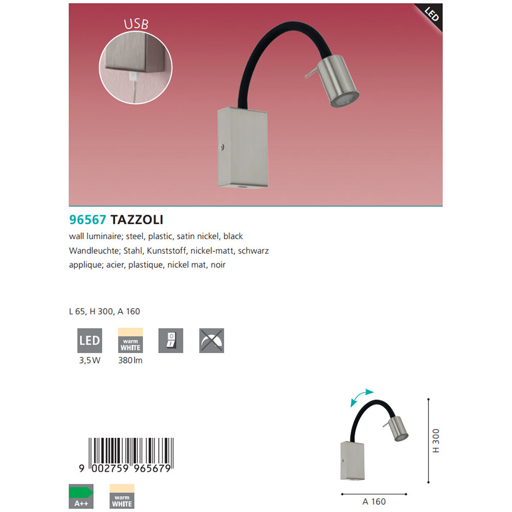 Бра - продукт известной компании Eglo (Австрия). Имеет максимальную мощность 3.5 Вт. Отлично подойдет для таких мест, как гостиная, прихожая и коридор, спальня, кабинет, офис, зал. Впишется в интерьеры следующих стилей: хай-тек.