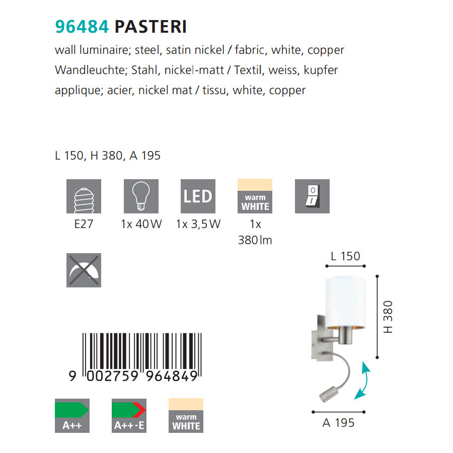 Бра EGLO 95726 (EGLO 96479 Pasteri) обзор
