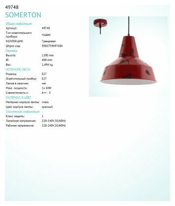 Сервис сравнения цен СкидкаГИД предлагает сравнить цены на товар «Подвесной светильник Eglo Somerton Somerton 49748»