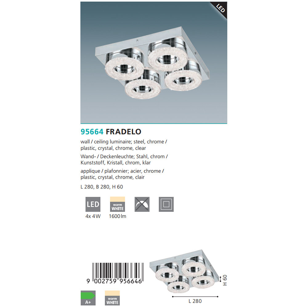 Потолочный светильник Fradelo LED 95664 - продукт известной компании Eglo (Австрия). Имеет максимальную мощность 16 Вт. Отлично подойдет для таких мест, как кухня. Впишется в интерьеры следующих стилей: хай-тек.