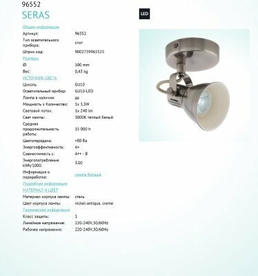 Спот - продукт известной компании Eglo (Австрия). Имеет максимальную мощность 3.3 Вт. Отлично подойдет для таких мест, как прихожая и коридор, кафе, кухня, дача, офис, магазин, над кухонным островом, веранда и беседка. Впишется в интерьеры следующих стилей: лофт, техно.