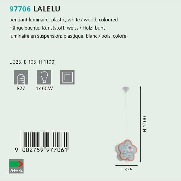 Подвесной светильник Lalelu 97706 - продукт известной компании Eglo (Австрия). Имеет максимальную мощность 60 Вт, освещает площадь до 3 кв. м. Отлично подойдет для таких мест, как детская. Впишется в интерьеры следующих стилей: яркое и цветное.