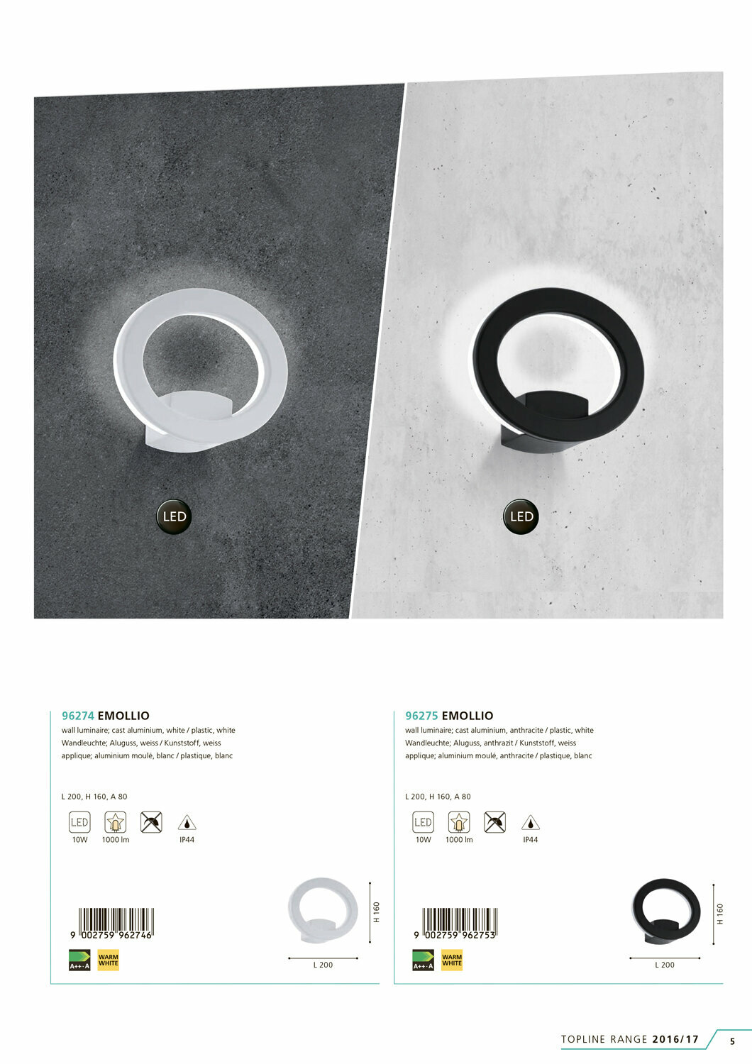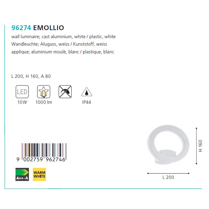 Настенный светильник уличный Emollio 96274 - продукт известной компании Eglo (Австрия). Имеет максимальную мощность 10 Вт, освещает площадь до 1 кв. м. Отлично подойдет для таких мест, как дача, фасад, веранда и беседка. Впишется в интерьеры следующих стилей: минимализм, хай-тек.
