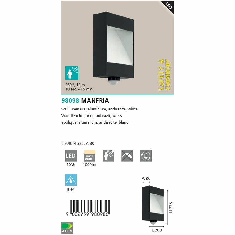 Настенный светильник уличный Manfria 98098 - продукт известной компании Eglo (Австрия). Имеет максимальную мощность 10 Вт, освещает площадь до 2 кв. м. Отлично подойдет для таких мест, как дача, фасад, веранда и беседка. Впишется в интерьеры следующих стилей: современный.