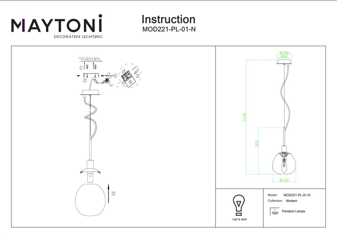 Подвесной светильник - продукт известной компании Maytoni (Германия). Имеет максимальную мощность 40 Вт, освещает площадь до 2 кв. м. Отлично подойдет для таких мест, как гостиная, кафе, кухня, над кухонным островом, офис. Впишется в интерьеры следующих стилей: модерн.