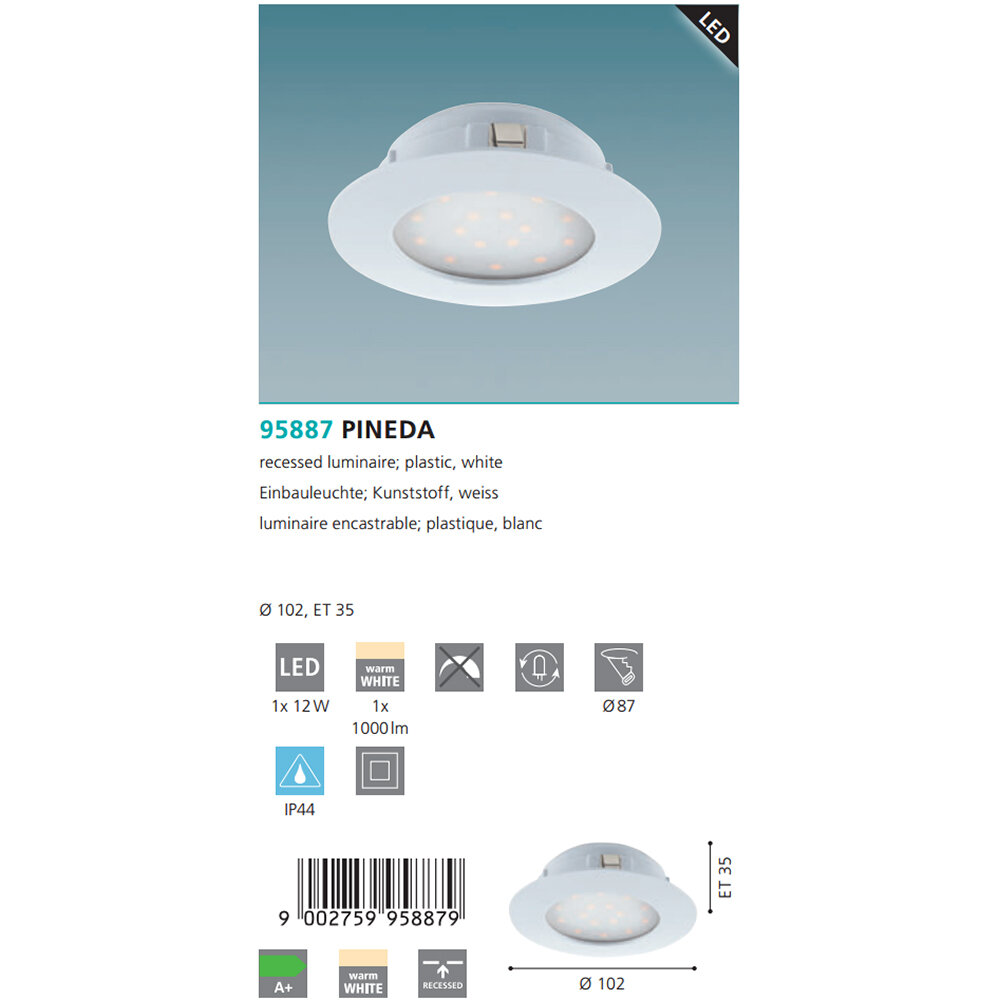 Встраиваемый светильник Pineda 95887 - продукт известной компании Eglo (Австрия). Имеет максимальную мощность 12 Вт, освещает площадь до 1 кв. м. Отлично подойдет для таких мест, как гостиная, прихожая и коридор, кафе, спальня, кабинет, кухня, над обеденным столом, офис, магазин, над кухонным островом, зал. Впишется в интерьеры следующих стилей: современный, минимализм, хай-тек, техно.