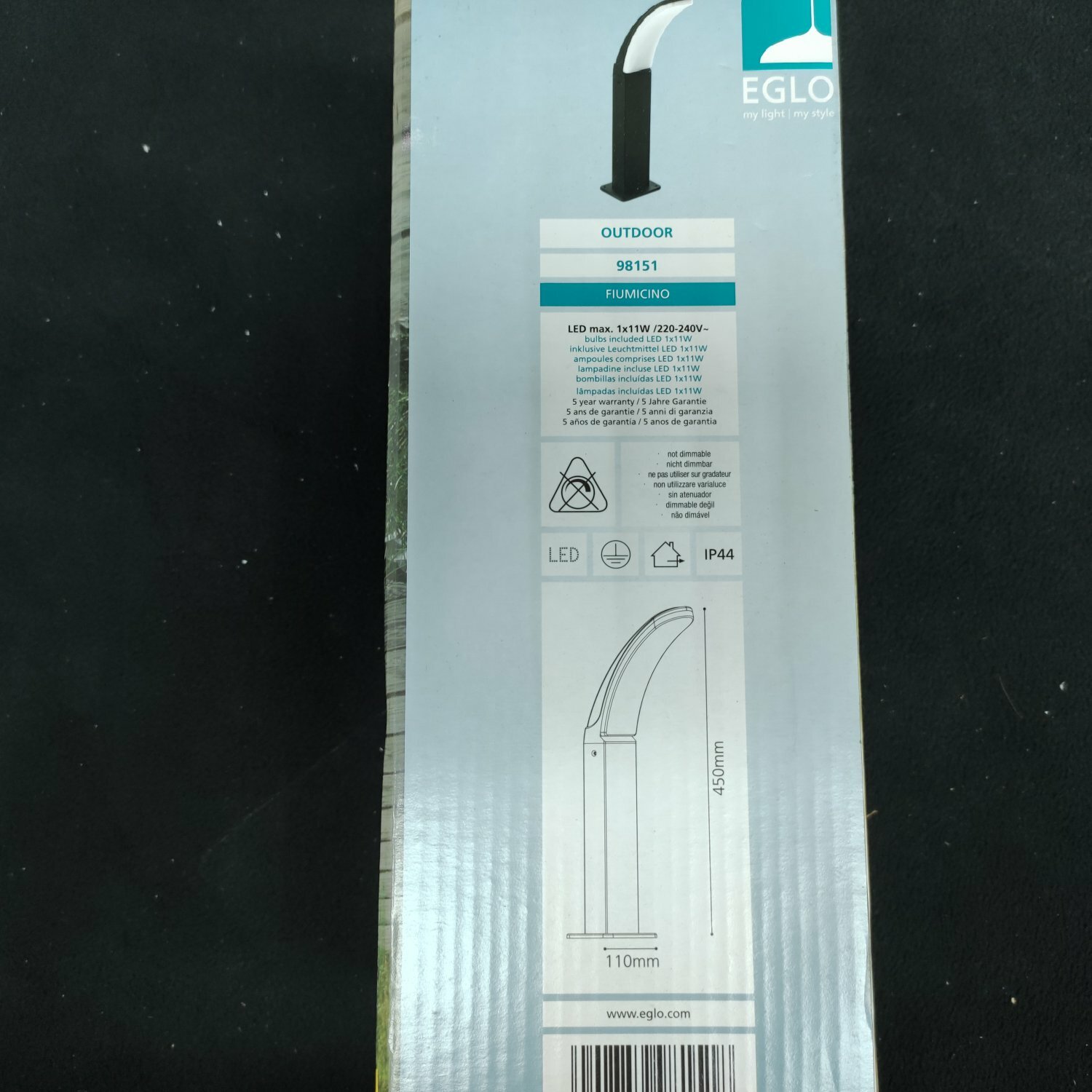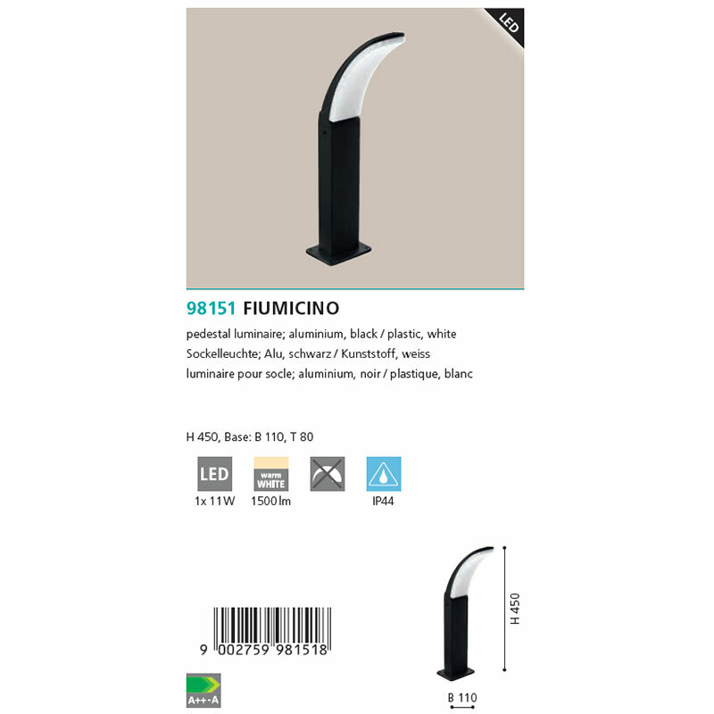 Наземный светильник Fiumicino 98151 - продукт известной компании Eglo (Австрия). Имеет максимальную мощность 11 Вт, освещает площадь до 2 кв. м. Отлично подойдет для таких мест, как дача, сад. Впишется в интерьеры следующих стилей: современный.