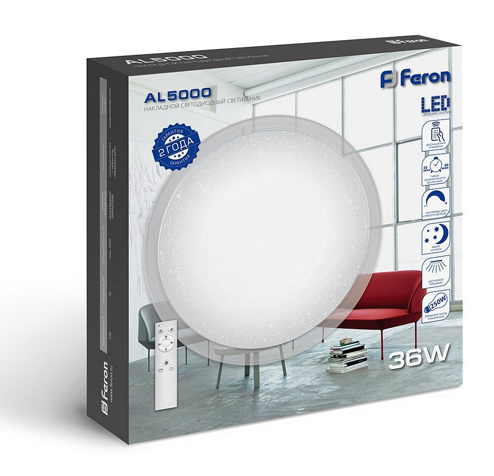 Потолочный светильник - продукт известной компании Feron (Китай). Имеет максимальную мощность 36 Вт, освещает площадь до 7 кв. м. Отлично подойдет для таких мест, как гостиная, спальня, кухня, офис. Впишется в интерьеры следующих стилей: современный.