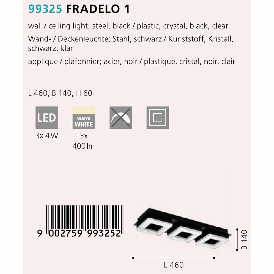 Настенно-потолочный светильник Fradelo 95658 - продукт известной компании Eglo (Австрия). Имеет максимальную мощность 36 Вт, освещает площадь до 3 кв. м. Отлично подойдет для таких мест, как гостиная, прихожая и коридор, кафе, спальня, магазин, зал. Впишется в интерьеры следующих стилей: современный, минимализм, хай-тек.