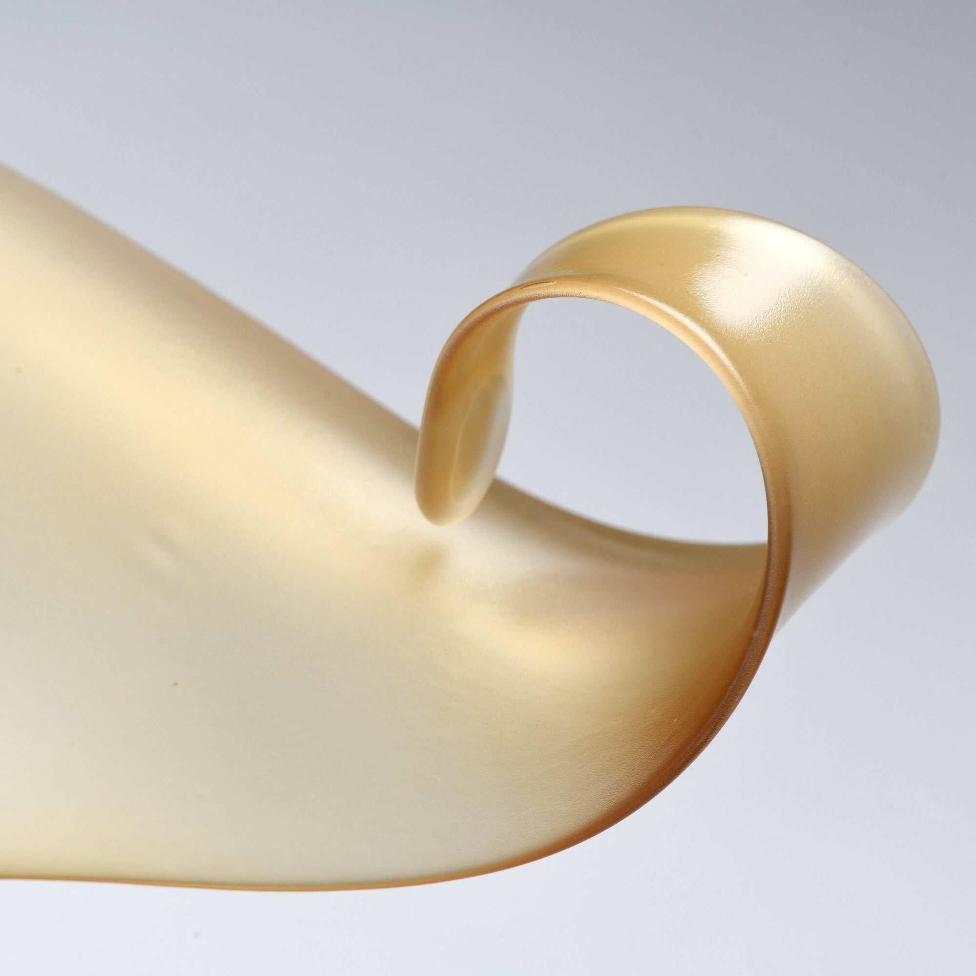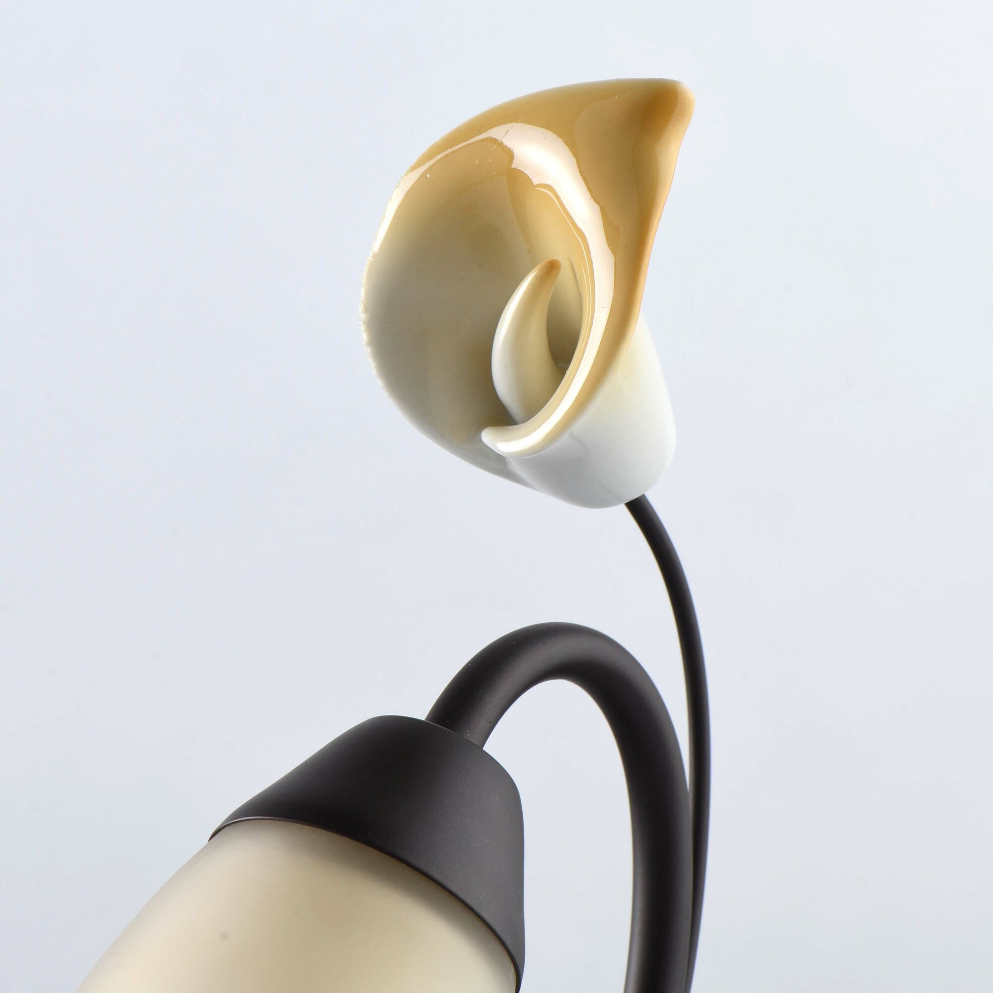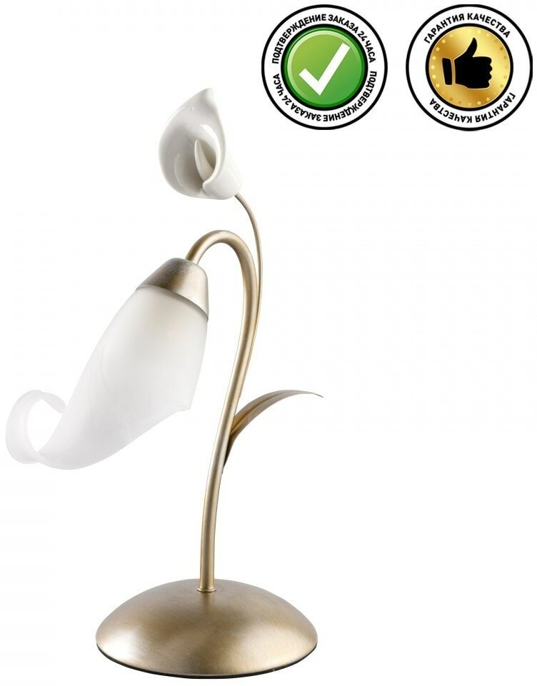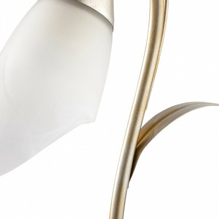 Основание светильника выполнено из металла и окрашено в цвет перламутрового золота. Плафон выполнен вручную из алебастрового стекла. Настольная лампа декорирована глазурированным фарфором белого цвета.