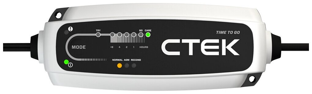 Зарядное устройство для автомобильного аккумулятора CTEK TIME TO GO характеризуется совершенно иным подходом к процессу зарядки аккумуляторных батарей — оно сообщит вам о том, когда батарею снова можно будет использовать. Последовательность светодиодных индикаторов указывает на различные этапы зарядки, а также на оставшееся до окончания зарядки время. Также данное устройство оснащено индикаторами, указывающими момент, когда батарея будет готова для ПРОБНОГО (TRY) запуска автомобиля, либо для нормальной эксплуатации (GO).